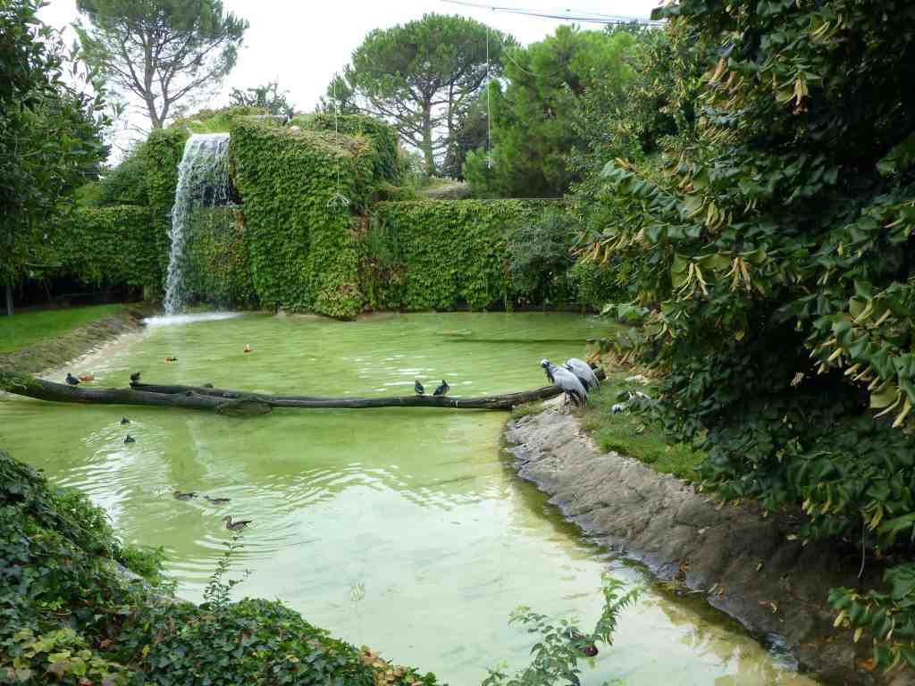 Из целия парк има множество фонтани и водопади, а зад този на снимката е къщата на влечугите.