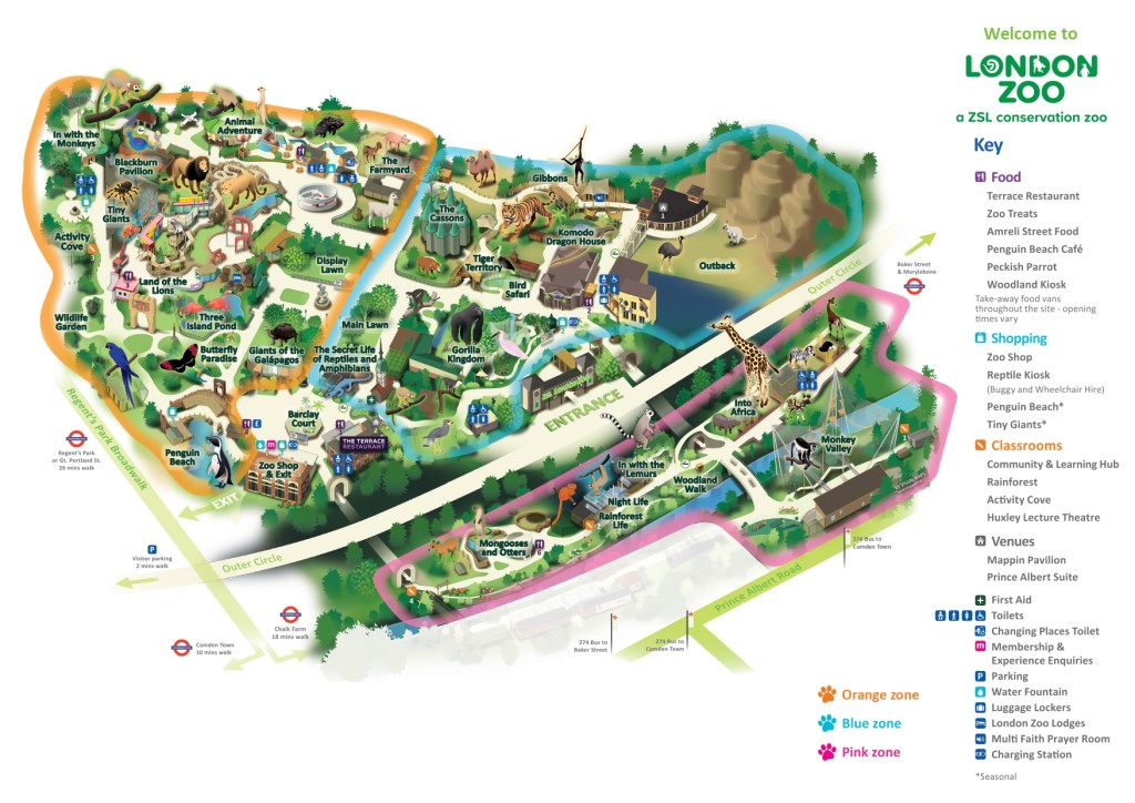 Местоположение: Зоопарка се намира в самия Лондон, като лесно може да се стигне с метро (спирка Camden Town), от там има около 15 минути пеша.