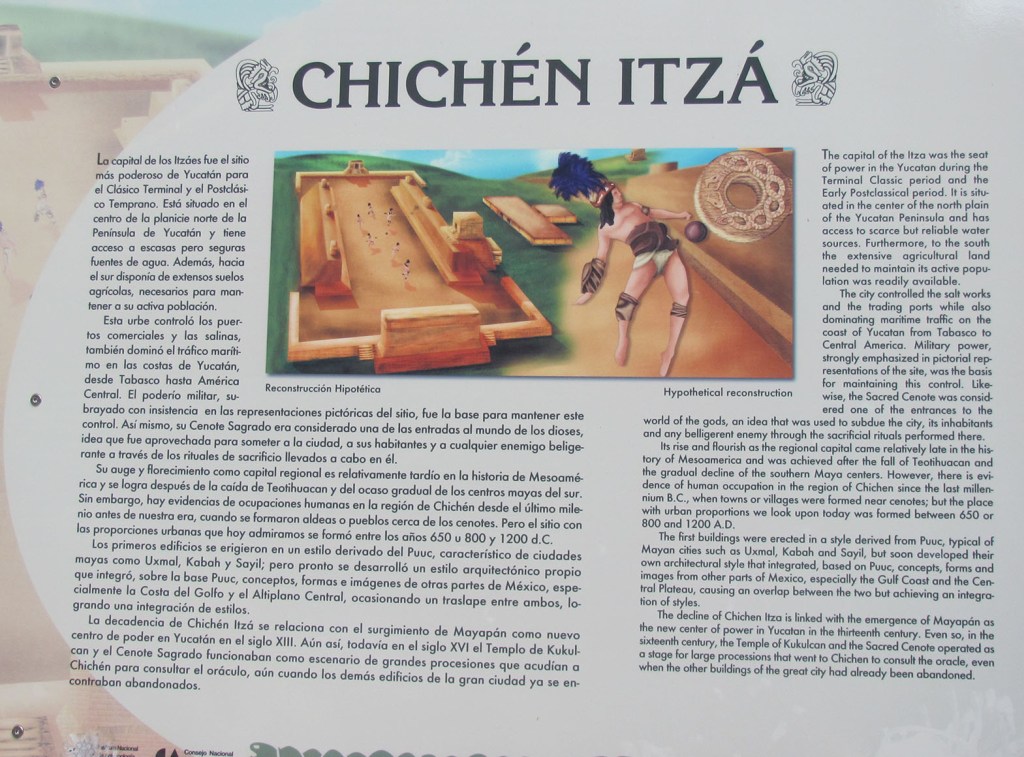 По пътя подминахме и научихме повече подземните пещери пълни с вода наречени сеноте. В момента имаше над 8000 сеноте в Мексико. Част от тези сеноте са с питейна вода, а други със замърсена вода. Имено такъв сеноте със замърсена вода щяхме да видим в Чичен ица. Иначе в древния град е имало 5 кладенеца, от които 4 са с питейна вода и 1 със замърсена вода. Именно последния обаче бил най-свещения за маите и ние щяхме да посетим именно него. Там са се извършвали много ритуали за бога на дъжда, като жертвоприношения му били давани деца и младежи, и по-рядко възрастни хора. Такива жертвоприношения били давани поради големите суши, които царели там. Сушата била особено опасна за насажденията от царевица. Ето защо маите смятали за свещени тези извори, които им осигурявали вода в сухите периоди. В това сеноте на Чичен ица бяха открити не само множество скелети във водата, но и накити и ценности от кехлибар, злато и сребро, корали от карибския залив и др. Тези находки можеха днес да се видят в музея в Мексико сити. Друга част можеха да се видят в университета Харвърд, където били донесени от археолога Едуард Томсън.