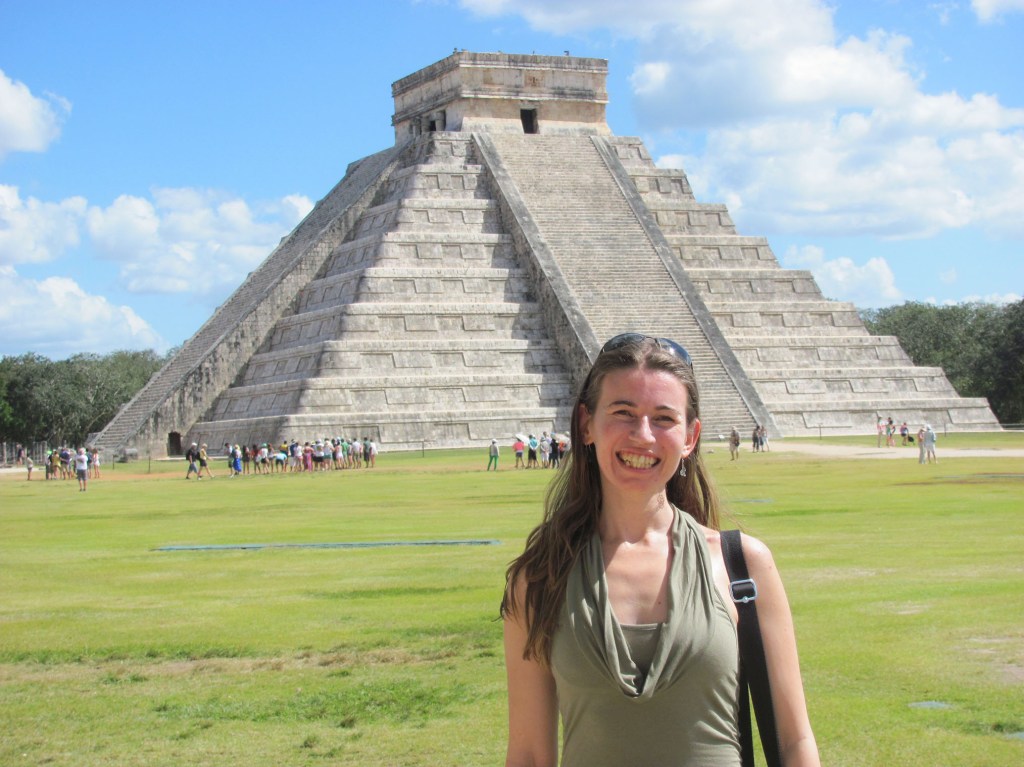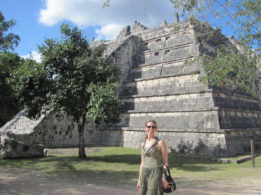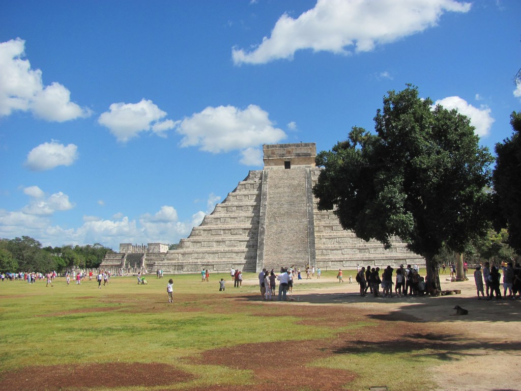 Първото нещо, което видяхме минавайки през входа на древния град на маите – Чичéн ицá бяха множеството амбулантни търговци, които продаваха маски и други традиционни сувенири. Движейки се в групата ние ги подминахме и не след дълго се озовахме пред голямата и най-висока пирамида на маите. Беше величествена, особена на фона на кристално синьото небе над нея и няколкото пухкави облачета за декорация. Основата на пирамидата бе квадрат, като височината на страните бе 24 метра издигащи се поетапно на 9 нива. Тук научихме, че пирамидите са играли важна роля в градовете на маите. За разлика от египтяните, те не са ползвали същите за гробници. Пирамидите са имали множество други предназначения, сред които място за провеждане на ритуали, за ориентиране на посоките (къде е север, юг, изток и запад), както и за календар. До върха на пирамидата имаше 91 стъпала, които олицетворяваха дните от годината. Умножени по четирите стени стават 364 плюс платформата отгоре 365 дни. Ако пирамидата се гледаше само от едната страна, то ъглите в нея бяха 18 или това бяха точно броя на месеците според слънчевия календар на маите. Особено интересен феномен се случваше на тази пирамида по време на пролетното и есенното равноденствие (21 март и септември). Тогава светлината така огряваше пирамидата, че се получаваше сянка по нейните ъгли, наподобяващи огромна змия, която се спускаше по тях. Едва ли случайно са постигнали този ефект и колко жалко, че съвременното строителство не е толкова прецизно, смислено и точно.