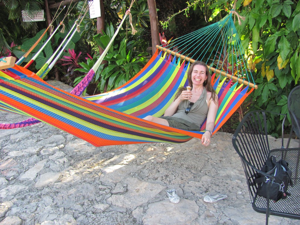 Ние също трябваше да изоставим това прекрасно място, качвайки се обратно в автобуса и отправяйки се към град Мерида, който беше на 120 км от Чичен ица. Преди това обаче, в 15:00 часа спряхме в крайпътен китен ресторант със сламени покриви носещ името Pueblo Maya. Яденето на бюфет с по едно студено питие ни излезе по 25 долара на човек. Храната не беше евтина, но ресторантът ми хареса с красивите си градини, където имаше и дървета с множество банани, както и пъстри удобни хамаци, за лека дрямка след обилната храна.