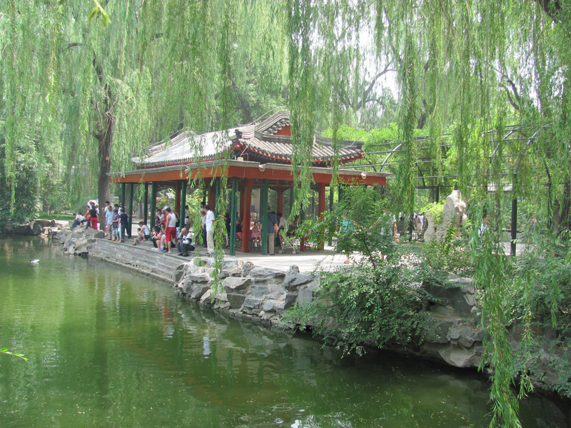Подобно на много от пекинските паркове и зоологическата градина е в стил китайски градини, с много цветя и дървета, примесени с малки поточета и реки, оформени хълмчета с накачени павилиони и исторически сгради. Пекинската зоологическа градина е известна с редките си животни, сред които са гигантските панди, златно-носовата маймуна, южно китайския тигър, ибис, китайски алигатор, гигантски китайски саламандър и др., както и други редки животни като сибирския тигър, снежно-белия леопард, тибетска газела и др. Тук има 13 от 15-те общо в света жерави. Поради жегата обаче голяма част от тях не успях да видя. Пандите, за които главно бях дошла обаче ме посрещнаха с ленива усмивка. Три от тях спяха, а четвъртата леко повдигна глава и се получи хубава снимка. За пандите бях чела, че се срещат само в гористите местности на Западен и Централен Китай и затова е обявена за национално съкровище. Голямата панда достига на дължина 120-180 см и тежи около 100 кг. Има отличителна окраска, като козината и е гъста и мръсно бяла. През плешките и предните крака минава широкочерна ивица. Задните крака са черни, има черни петънца по ушите и около очите. Има интересна, макар и много тъжна история за това как пандите са получили своята окраска: