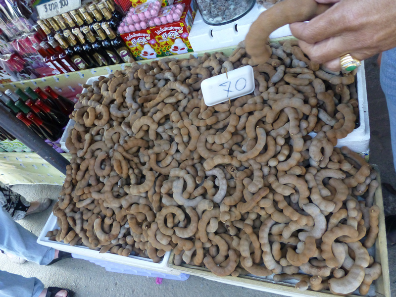 Показа ни и тайландска царевица, която освен жълта, можеше да бъде и с лилав цвят. Обясни ни как по цвета да разпознаваме хубавото помело – не трябва да е много жълто, нито тъмно зелено, а някъде по средата, както казва Буда – златната среда. Ананасът пък се познавал като се вземе в ръка и със средния пръст се почуквало. Когато звукът е „туп-туп-туп“ означавало, че не бил сочен и сладък, но когато звука е „кланк-кланк-кланк“ означавало, че е хубав и зрял. Нещо подобно, на това, което ние правихме с нашите дини. На пазара пробвахме темаринди, което прилича на пашкулче фъстък или рошко, отвътре има костилка и като вкус не е нещо особено, меко и безвкусно. Екскурзоводът ни показа още папая, нудели, оризово вино, което беше в дамаджани и имаше големи бамбукови сламки, с които се пробивала дамаджаната и се пиело от там. Накрая снимахме и плода Грег по, който представляваше голяма мъхеста диня. Тъй като плода, който ни показаха още не беше зрял, не можеше да се консумира суров – само сготвен или запечен на грил.
