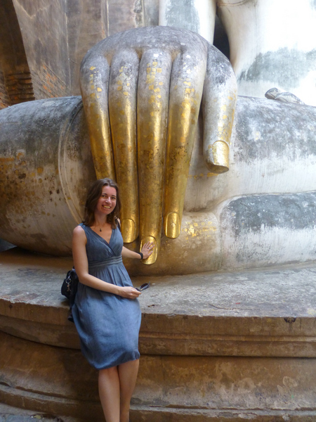 След неговото разглеждане се качихме обратно в автобуса, който ни отведе на централния вход на историческия парк и някогашната бляскава столица Сухотай. Екскурзоводът ни бе приготвил нова изненада – колелета под наем. Цялата ни група – млади или пенсионери, съвсем уверено се качиха и подкараха колелетата. Не бях карала колело от 12 години, но поговорката, че карането на колело не се забравя, се оказа учудващо вярна. Нямах проблем с велосипеда, просто не бях толкова уверена, че да карам и едновременно да правя снимки. Трябваше да се концентрирам и върху факта да карам в лявата лента, тъй като все пак бяхме в Тайланд и макар да твърдят, че никога не са били английска колония бяха възприели техните правила на шофиране. И така измежду останалите колоездачи и добре обособена велоалея, погледът ми любопитно се отклоняваше в страни, където бяха обособени езера с лотоси, в които се оглеждаха древни руини. Беше зашеметяващо красиво и колелото ми се движеше нестабилно от всички разсейвания. Накрая не се стърпях – спрях и снимах. Не успях да уловя птичите песни на снимките, но всичко останало излезе перфектно. Сутрешната слънчева светлина падаше меко, а загадъчните храмови руини се подаваха от всякъде. Групата ми се отдалечаваше и се опитах да я настигна. Като стигнах при тях, те си бяха паркирали колелетата и екскурзоводът им показваше статуя на разхождащ се Буда, нещо, което го имало само в Сухотай. Аз не успях да си паркирам колелото, накрая го облегнах на едно дърво и се присъединих към групата. В последствие като тръгнахме от това място и се отправихме с колелетата към следващия храм разбрах каква голяма грешка бях направила. По дървото, а вече и по цялото ми колело, се разхождаха големи червени мравки. Един от немците ми помогна да ги прогоня, а след това ми показа и как се сваля и поставя стойката за паркиране.