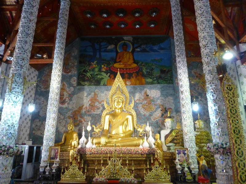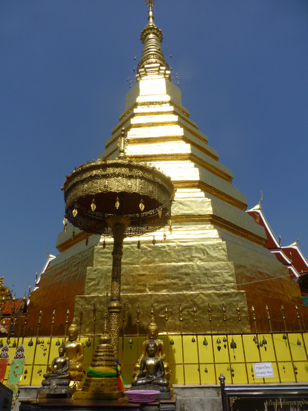 Екскурзионната ни програма продължи с посещението на кралския храм Phra That Cho Hae, който се намираше на 28 метра височина в планината и бе издигнат преди 700 години, когато столица е била Сухотай. Особено интересни тук бяха пъстрите стъклени мозайки по стъклата и ослепително блестящата златна чеди издигаща се на 33 метра. Според легендите в нея се пазят част от косите на Буда. В храма имаше и много красива златна статуя на Буда, а дворът бе изпъстрен с множество цветя и статуи. На следващия ден в храма щеше да се проведе празник, затова местните наблягаха на златистата украса. От двете страни на пътя пред входа имаше знамена, като същите показваха, от къде щеше да мине предстоящата тържествена процесия. Имаше и много улични търговци, които предлагаха мед в бутилки.