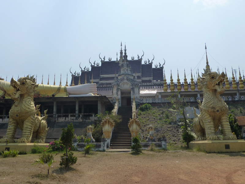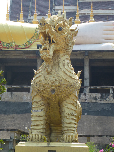 След това направихме кратка фотопауза пред един ново издигнат храм, чиято огромна статуя на полегнал Буда много ми хареса. Особено ме впечатлиха златните статуи на два дракона, които пазеха входа към храма и в чиито усти, седнал на езика отново стоеше Буда. По парапета на стълбите отново имаше статуи на мистичните петглави змии, но за съжаление нямахме време да се качим по стълбите и надникнем в храма, който от вън много ми допадна.