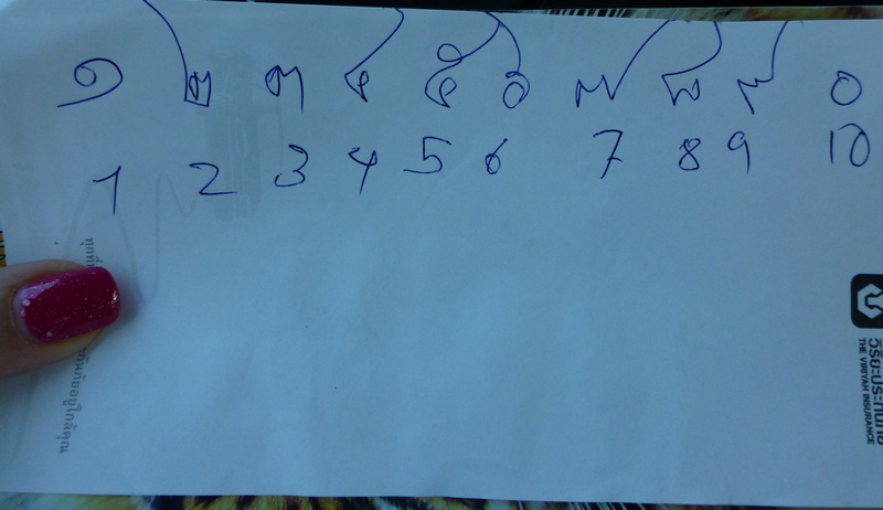 Тайландците изписваха и числата по различен начин, като екскурзоводът пусна в рейса един лист, на който изписа числата от 1 до 10. Ченгелчетата приличаха на изкривени символи и букви. Тези числа бяха изписани и на техните монети и банкноти, което в началото ни бе затруднило.