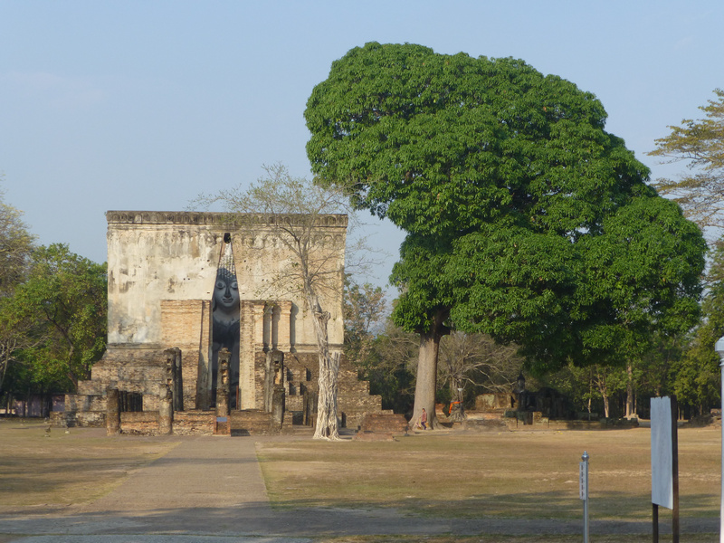 Преживяването беше неповторимо. Каруцата друсаше здраво, отпред тайландеца си тананикаше и от време на време придърпваше юздите на добичето, което ми се стори, че има много тънки крачета. Силно въодушевени стигнахме до храма Wat Si Chum (в превод Храмът на дървото бодхи), където впечатляващи бяха не само високите „бодхи“ дървета с оранжеви цветчета, но и статуята на Буда висока почти колкото тях. Огромният Буда (15 метра височина и 11 метра широчина) бе седнал в поза Лотос, а изражението му бе известно като Phra Acana или „този, който не се страхува“. Пръстите на дясната му ръка бяха спуснати надолу към богинята Земя, като имаха златно покритие. Според легендата, когато бирманската армия нападнала Сухотай се натъкнала на тази статуя и войниците избягали щом я видели. За разлика от тях туристите вместо да бягат, все повече прииждат тук възхищавайки се на древните руини на този издигнат през 13-ти век храм.