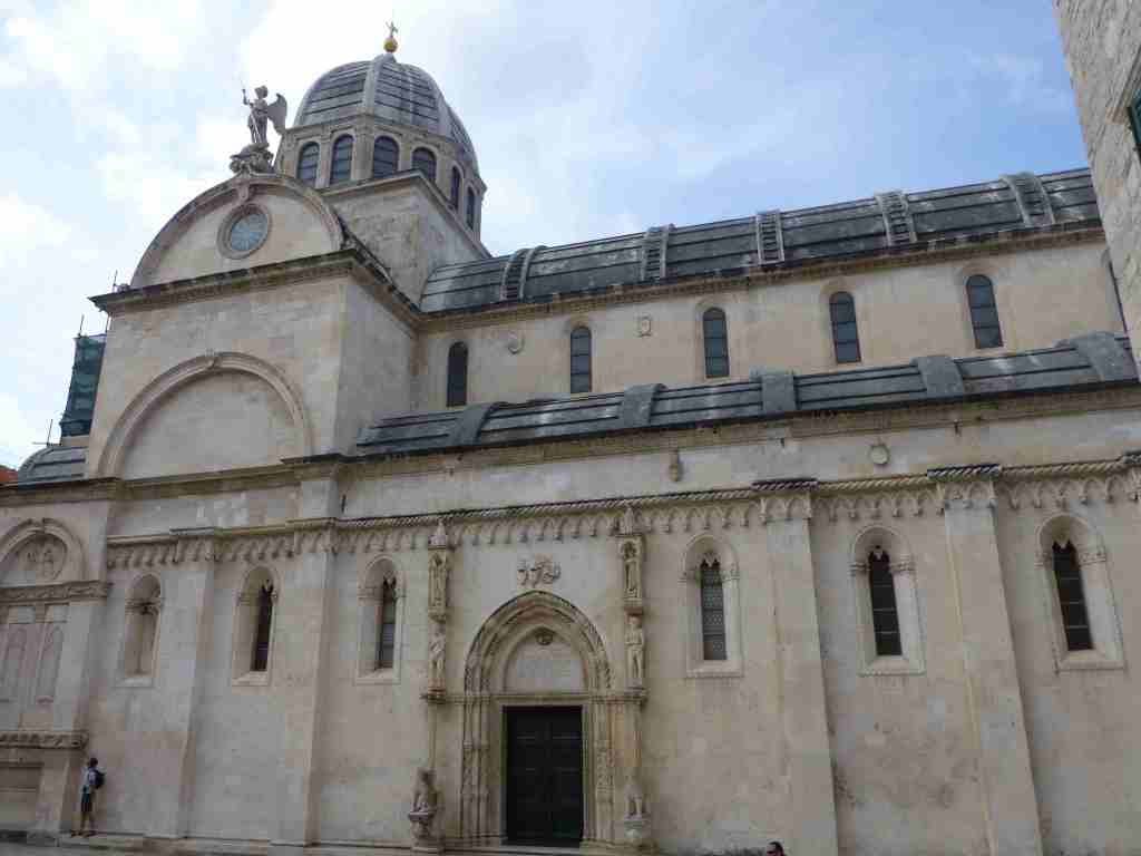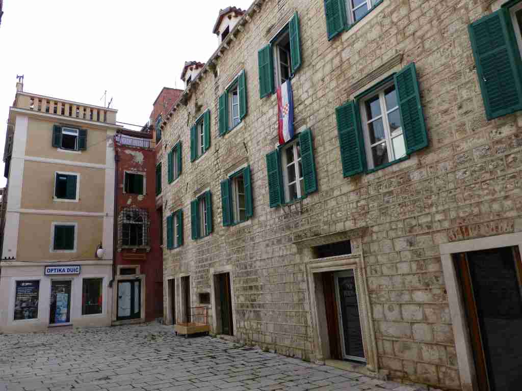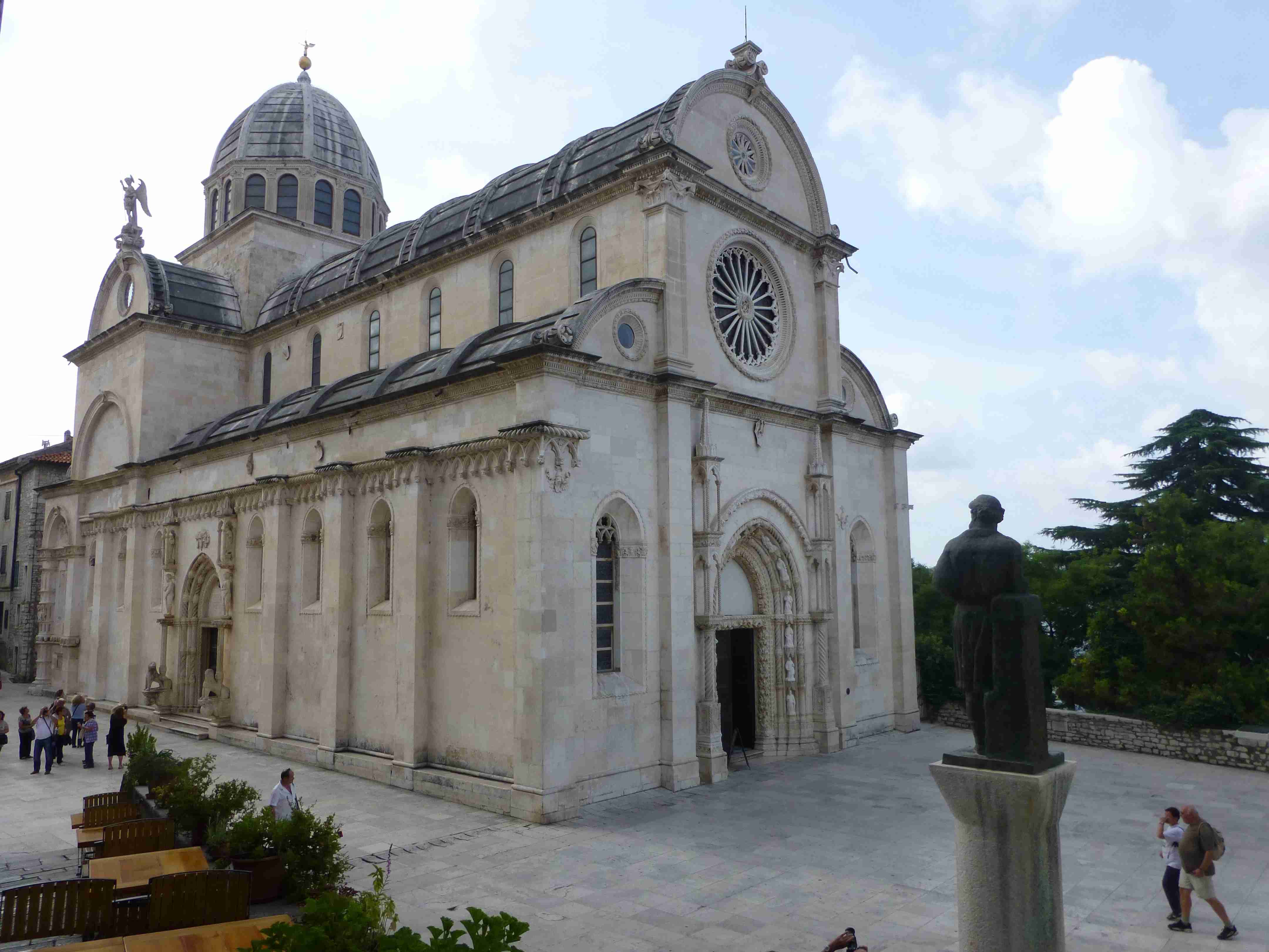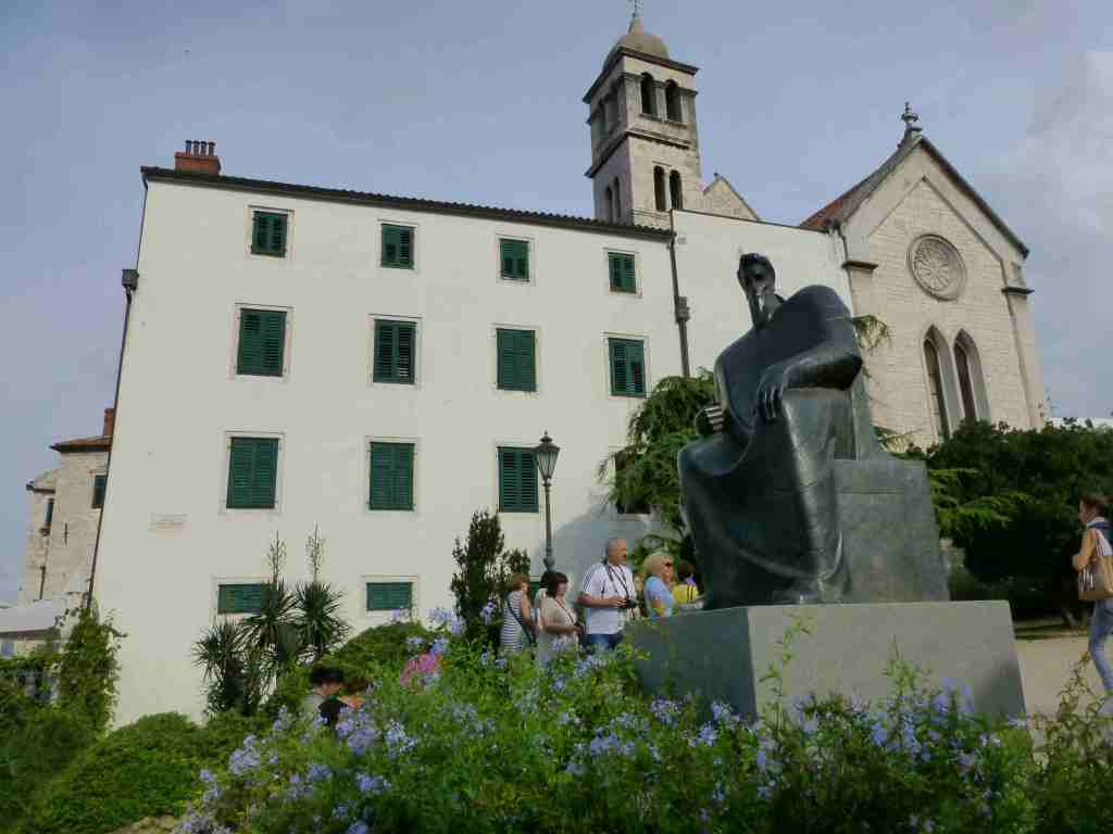 От дясната страна на паметника хърватския владетел Крашимир има красива църква с камбанария, а зад него се разпростира красив зелен парк с фонтан. Продължихме към известната катедрала на Св. Якоб, като по пътя имаше тесни пешеходни улици, които бяха почти толкова тесни колкото неаполските и хората спокойно можеха да си подават предмети от една къща на друга, протягайки ръце през прозорците. Спряхме се пред каменна сграда с висока камбанария до която се издигаше още по-високата часовникова кула, на чийто връх се развяваше хърватското знаме.