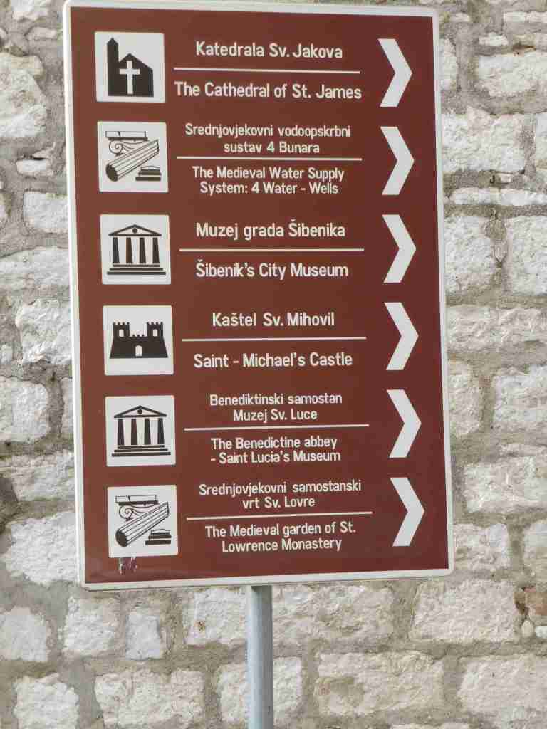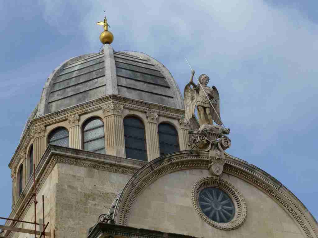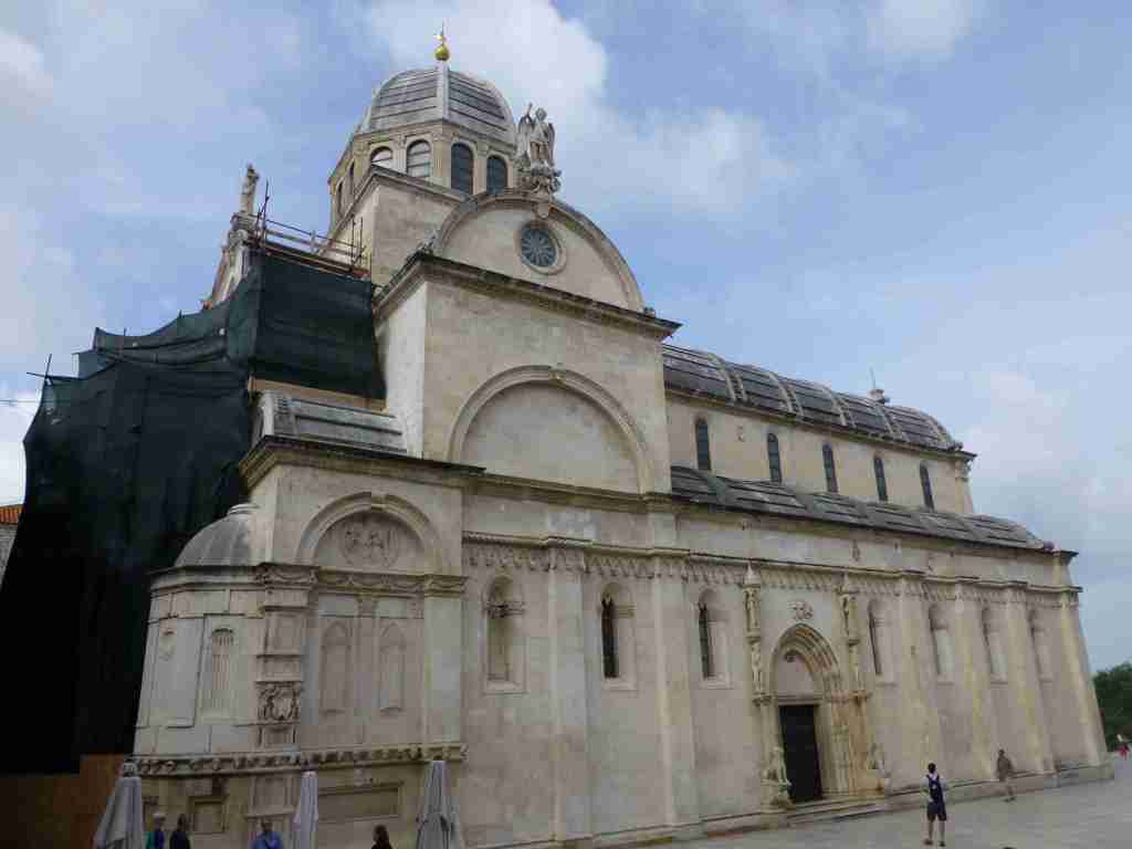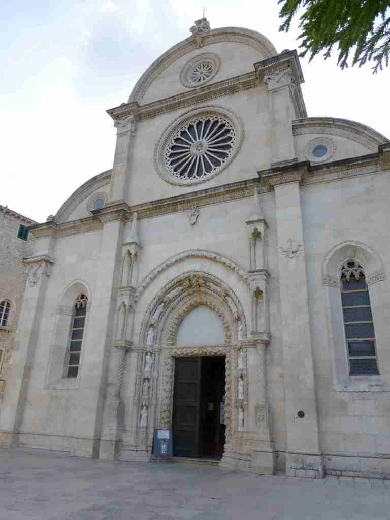 От дясната страна на паметника хърватския владетел Крашимир има красива църква с камбанария, а зад него се разпростира красив зелен парк с фонтан. Продължихме към известната катедрала на Св. Якоб, като по пътя имаше тесни пешеходни улици, които бяха почти толкова тесни колкото неаполските и хората спокойно можеха да си подават предмети от една къща на друга, протягайки ръце през прозорците. Спряхме се пред каменна сграда с висока камбанария до която се издигаше още по-високата часовникова кула, на чийто връх се развяваше хърватското знаме.