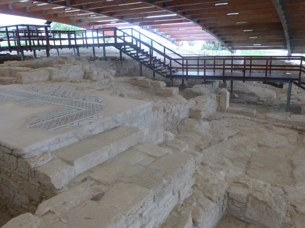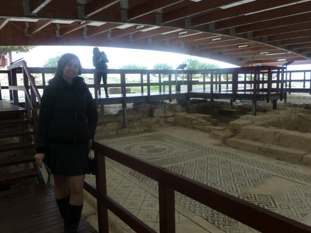 Отправихме се към следващите исторически забележителности – руините на древния град Курион. Тук входните билети бяха по-скъпи (4.50 евро на човек, докато за замъка входа бе 2.50 евро), но напълно си заслужаваха. Курион напълно можеше да се конкурира с красивите древни градове като Ефес и Помпей, които наскоро бях посетила. Древният Курион бил главен център на културния, политическия и религиозния живот. Тук е бил издигнат известния олтар на Аполон, който по-късно станал седалище на християнския архиепископ. Издигнат на стръмен хълм, градът бил създаден през 12 в.пр.н.ер. от гръцките микийци, като по римско време продължил да се разраства. Градът имал стратегическо отбранително местоположение и можел лесно да контролира близките плодородни земи. Курион бил разрушен от две катастрофални земетресения в началото на 4-ти век. Разходката ни започна от къщата на Евстолиос, която гледаше към морето и имаше много красиви мраморни мозайки запазени и до днес. Дългата правоъгълна стая беше разделена на четири части: две декорирани с изчистени геометрични мотиви, третата с картина на яребица и на четвъртата имаше изображение на млада жена държаща измервателен инструмент. Според надписите около нейната глава, младата жена е Ktisis и изобразява създаването на света. От къщата бяха останали няколко бели колонии, основата на стени и разбира се прекрасната гледка към морето.