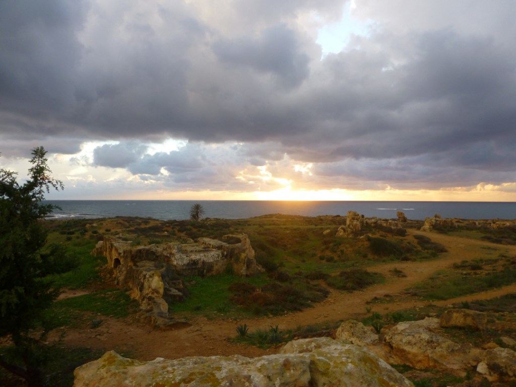 Тъкмо разгледахме зоологическата градина и отново заваля – този път силен дъжд като изведро с няколко гръмотевици за разнообразие. Все още валеше като стигнахме Царските гробници в Пафос, но намаления дъжд ни прикани да излезем от колата и разгледаме тези уникални руини. Слънчевите лъчи на залязващото вече слънце разбутаха облаците и ни позволиха да се насладим на феноменалния залез. Името на царските гробници всъщност не включваше гробовете на нито един цар, а само на аристокрация. Целият комплекс представляваше широка система от пещери и каменни гробове датиращи от елинската и римската ера (3 в.пр.н.ер. и 3 в.н.ера). Осем надгробни комплекса бяха отворени за посещение, като каменни стъпала ни отведоха до подземните помещения. Някои от гробовете имаха колони, други – стенописи. Залеза на живота бе подсилен със залеза на днешния ден. Разходката ни бе пълноценна. Останаха още много неща да бъдат посетени на острова, но за малкото дни тук успяхме да оползотворим максимално времето в разходки.