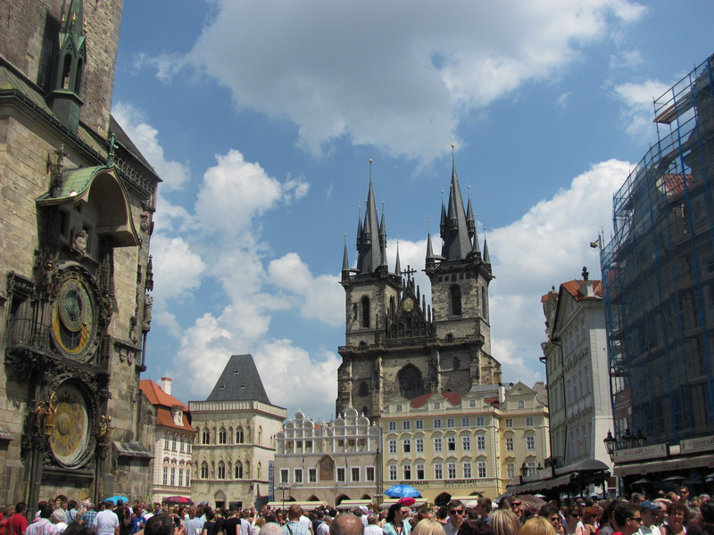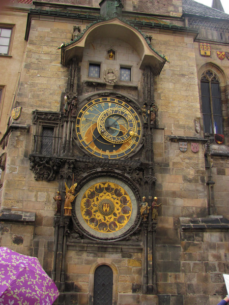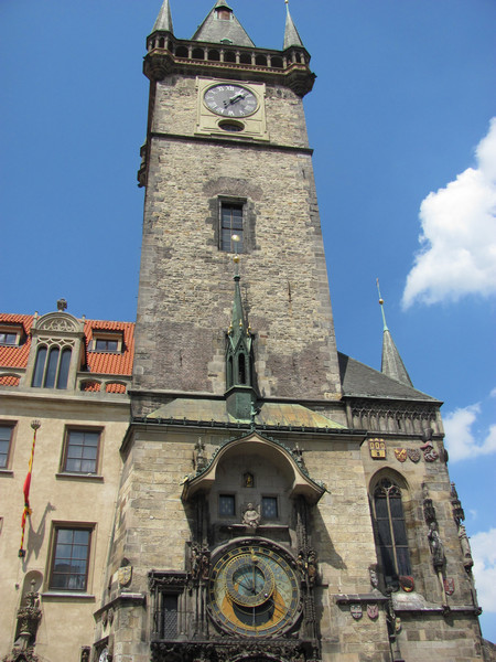 Следващата голяма атракция в стария град е астрономическия часовник, издигнат на южната фасада на старото кметство, което днес е общината. Монтиран през 1410 г, Пражкият часовник е третият астрономически часовник в света и най-старият, който функционира и днес. Механизмът на часовника е съставен от 3 части: астрономически показател, показващ положението на Слънцето и луната; Разходката на Апостолите, която на всеки кръгъл час изобразяват фигурки на Дванадесетте апостоли и други същества, сред които и фигура на Смъртта представена като скелет и календарна скала представляващи месеците. Според местна легенда, градът ще разцъфтява докато часовника работи и ще следват беди, ако часовника бъде занемарен. Наистина е уникално и забавно не само да се гледат фигурките на апостолите, които се изнизват една по една, но и тълпите хора, които се събират, гледат и снимат тази церемония датираща на повече от 600 години. За съжаление фотоапаратът ми не успя да направи клипче на въртящите се в кръг Дванайсет светци, които сякаш минават и поздравяват всеки турист. Затова докато чакахме следващия кръгъл час се качихме на часовниковата кула, от където се разкриваше прекрасна панорама на Старата част на Прага. От високо си харесахме едно ресторантче на централния площад, където по-късно обядвахме.