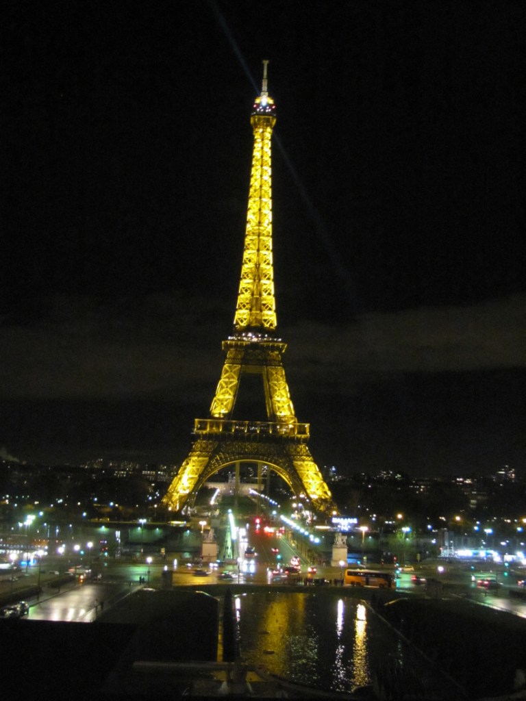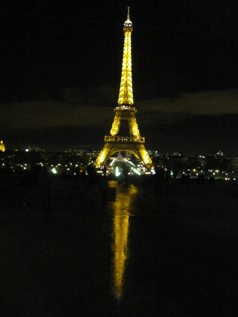 Ние се разходихме само до половината на този прочут булевард, търсейки метростанция, от където взехме метрото и се отправихме към другото съкровище на Париж – Айфеловата кула. По време на пътуванията с метрото на няколко пъти минахме покрай Айфеловата кула, но чак сега отидохме специално да я видим и снимаме, докато бе осветена с хиляди лампички. Беше сияйна и красива, като отражението й на мокрия асфалт също блестеше.