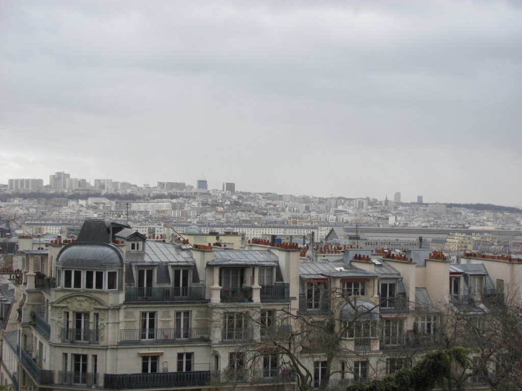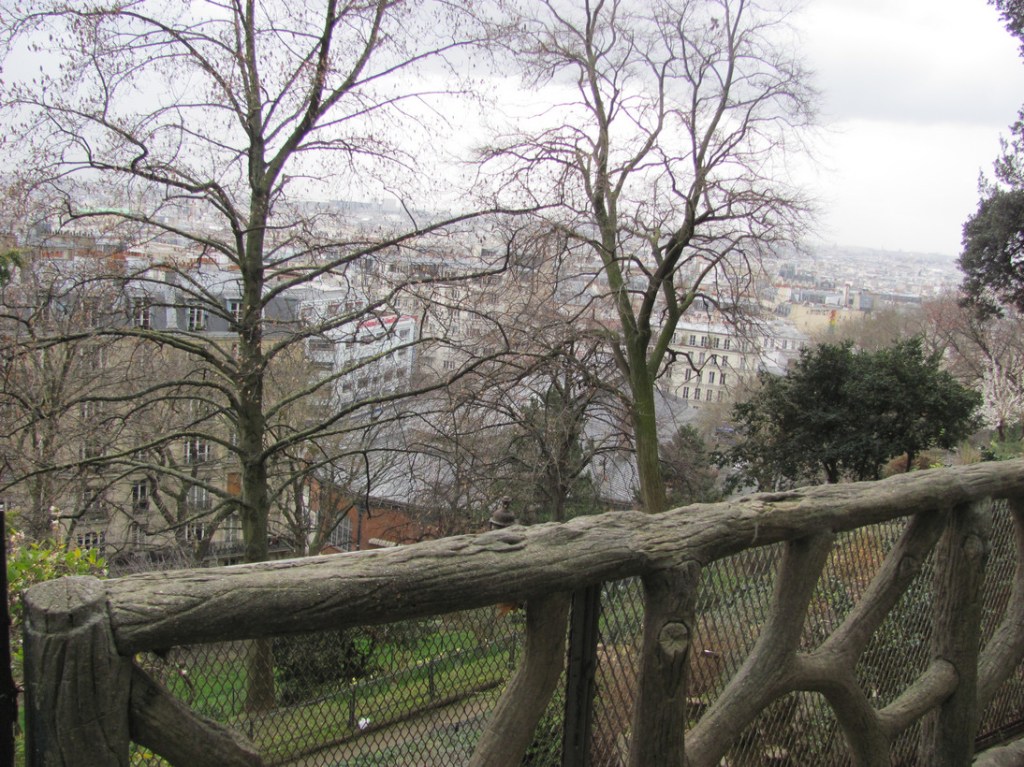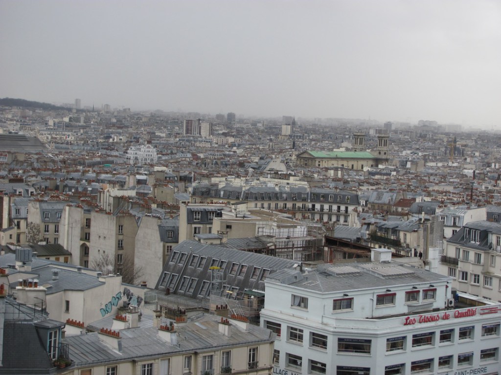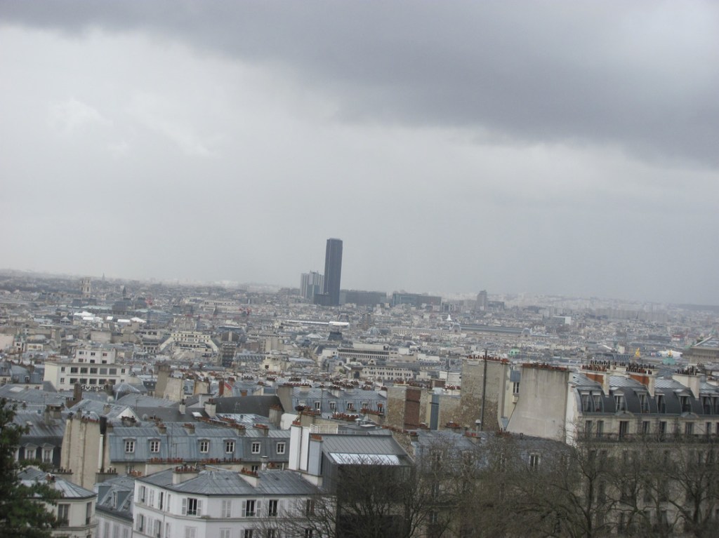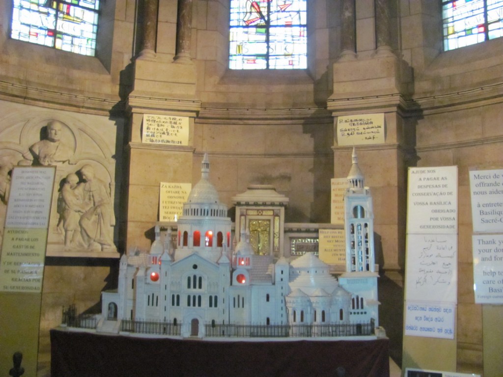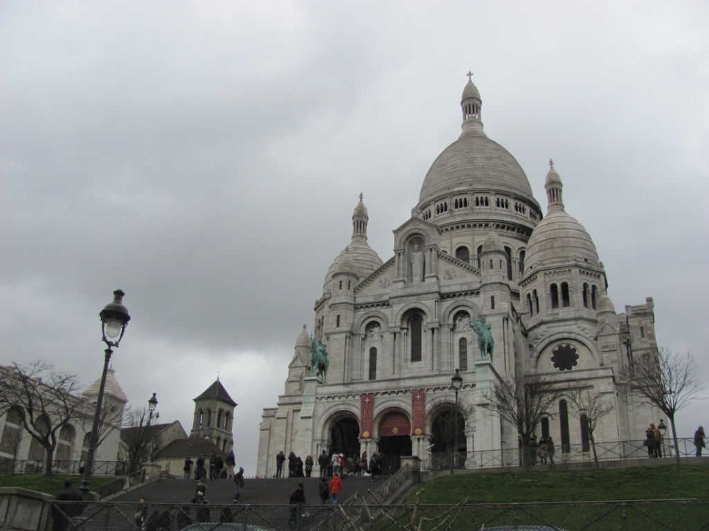 Вървяхме пеша към хълма Монмартър, където по римско време е имало два храма посветени съответно на Марс и Меркурий. Днес там се издигаше красивата катедрала Sacre-coeur / Сакре кьор (Свято сърце Исусово), построена от бял мрамор в типично римско-византийски стил с кръгли куполи. Катедралата бе завършена през 1889 г., но осветена чак през 1919 г. В камбанарията й, висока 83 метра, биеше една от най-големите камбани в света, тежаща 19 тона. Същата не бе никак лесна за фотографиране. Трябваше да слезем по стотиците стъпала, за да можем да снимаме цялата катедрала. Преди това обаче влязохме в нея, за да се скрием от засилилия се дъжд, а и за да се стоплим от студения вятър. Снимането в катедралата бе забранено, затова попивахме жадно с очи красивите олтари и пищни декорации. Вътре беше пълно с хора, и почти всички напълно мокри от дъжда.