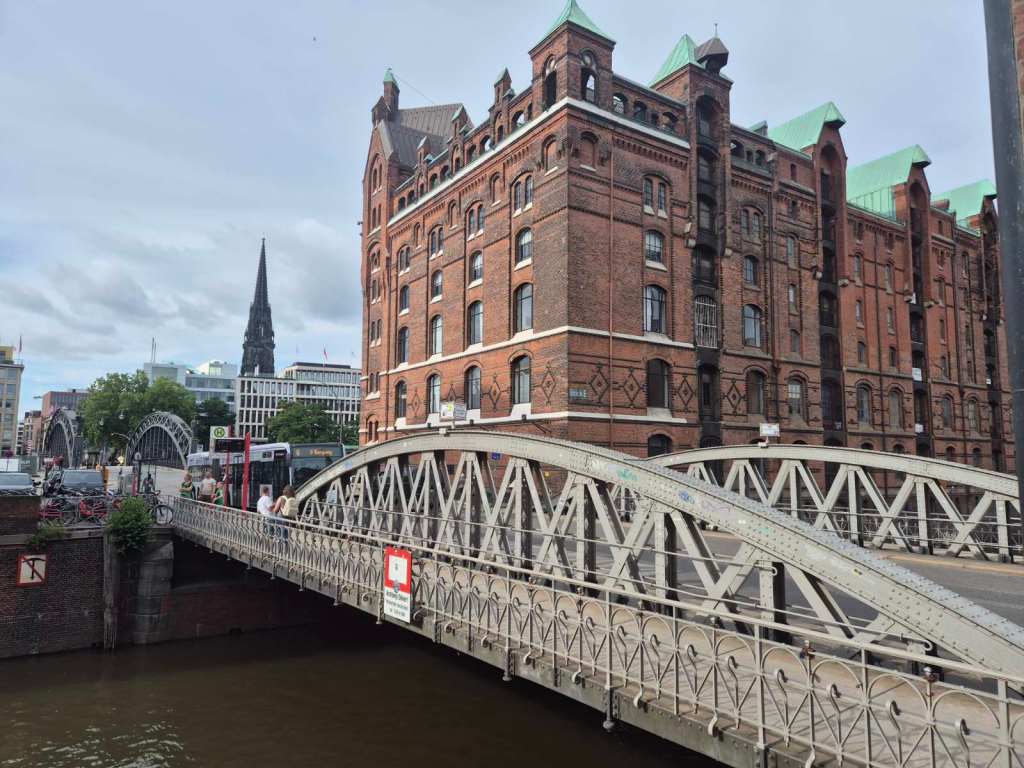 Дори да решите да разгледате града пеша, пак един от най-хубавите начини е да се движите покрай каналите на града, и минете по някои от 2500-те моста. Интересен факт е, че Хамбург има повече мостове от Венеция, Амстердам и Лондон взети заедно. Особен красив е Poggenmühlenbrücke, от където се вижда Speicherstadt – най-големият складов район в света, изграден между 1883 и 1927 г., където сградите стоят на дървени основи и дъбови трупи, имат изящни неоготически фасади, кули и стъклени мозайки.