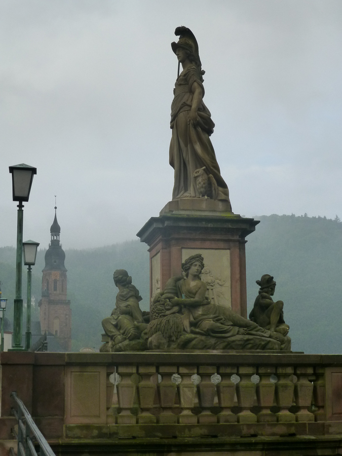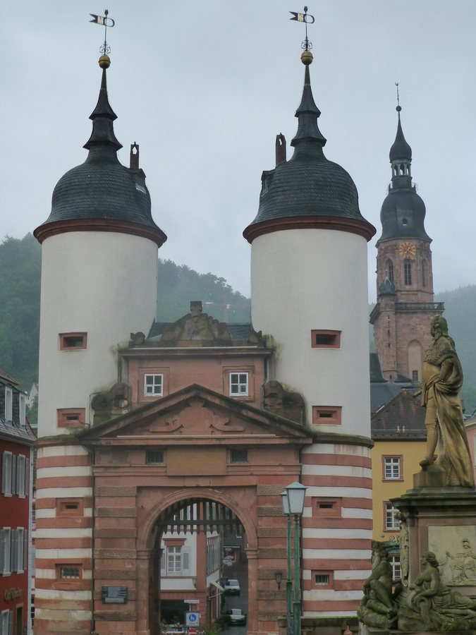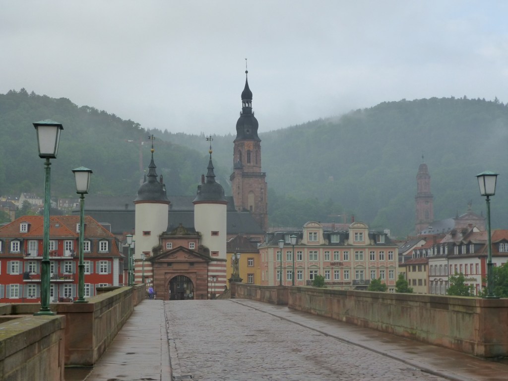 Разходката започна от Alte Brücke / Старият мост, който на дневна светлина бе много по-впечатляващ. Мостът носеше още името Karl-Theodor-Brücke и бе издигнат през 1788 г. свързвайки старата част на града с източния квартал Neuenheim. Поради наводнения мостът бе изграждан 9 пъти, като през 1788 г. бе направен изцяло от камък с 8 опори. От към старата част на града мостът имаше красиви средновековни кули, които са служили както за жилища на пазачите на моста, така и за затвор. Същите се издигаха на 28 метра височина и бялата им фасада бе отлична за снимки. По самия мост бяха издигнати красиви статуи подобно на Карловския мост в Прага. На една от статуите бе представен самият Карл-Теодор, а на другата богинята Миневра, която била на почит в Университета в Хайделберг.