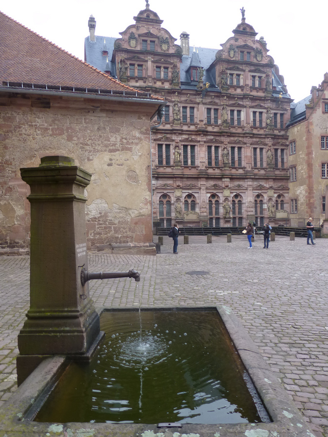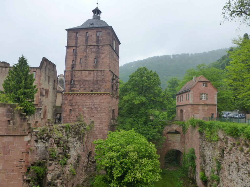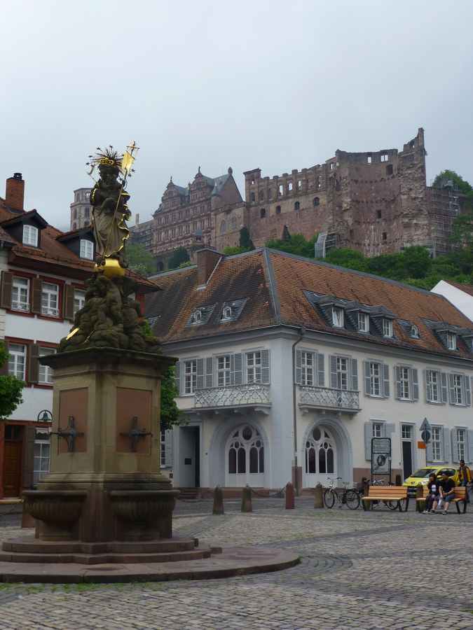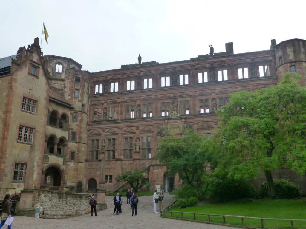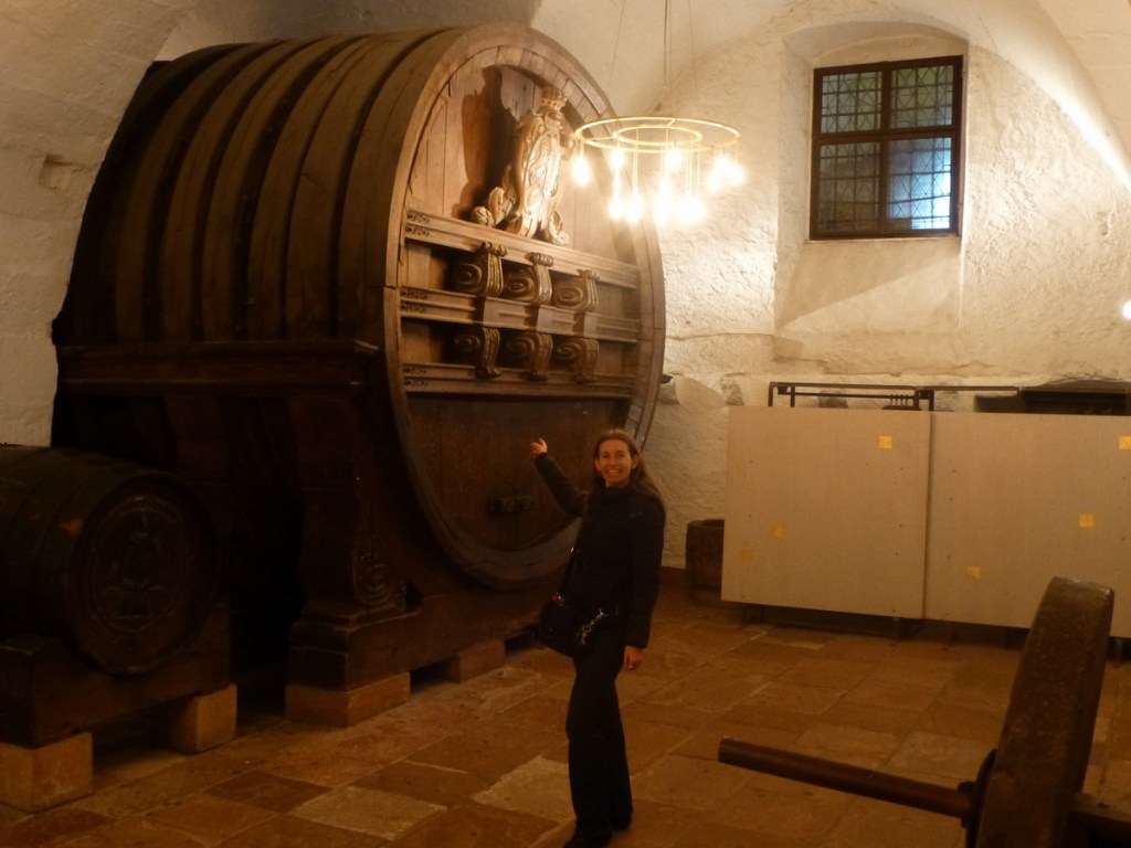 Продължихме покрай дългата сграда на кметството и излязохме на още един много красив площад, на който имаше красива статуя на Мадона с дете в ръце и с позлатен венец. Снимките тук бяха отлични, защото освен статуята от хълма се подаваше и красивия замък, към който се бяхме отправили. В края на площада тръгваше фуникуляра (кабинковия надземен лифт), който ни отведе до замъка. С фуникуляра можехме да стигнем и до Königstuhl, който беше най-високия хълм в Хайделберг издигащ се на 567.8 метра. Следобеда обаче трябваше да хванем влака за Нюрнберг, затова се задоволихме само с разходка на прочутия замък на Хайделберг. Същият бил многократно разрушаван и издиган наново, като всеки владетел го реконстроирал по свое виждане и съгласно своето време. Това придаваше на руините едно очарование, което стотиците снимки там едва ли успяха да уловят. Разходихме се из различните панорамни и вътрешни дворове на готическо-ренесансовия замък. Най-старите постройки датираха от 13-ти век. Голяма част от замъка беше в руини, но влизайки във вътрешния двор се впечатлихме от останалите постройки. Влязохме в подземната изба, където бе изложена най-голямата бъчва, която бях виждала. Според легендата в нея се събирали вината, които поданиците плащали като налог. В тази бъчва се смесвали всякакви вина и едва ли комбинацията била добра, но поне пазачът на бъчвата – кралския шут Перке но, я оценявал. Името му било Перке но (от италиански Защо не), защото когато му предлагали питие той винаги отговарял Перке но? Веднъж обаче изпил една чаша и умрял, хората погледали какво имало в чашата – вероятно отрова, но се оказало вода – той просто не бил свикнал с тази течност. Бъчвата наистина беше огромна, според брошурите можеше да побере 221 726 литра и бе изработена от 130 дъбови дървета. На нас ни трябваше да се качим по стълба, за да стигнем до върха й, от там имаше панорамна площадка, с която да я обходим от всички страни, след което слизахме по друга стълба, озовавайки се пред статуя на Перке но.