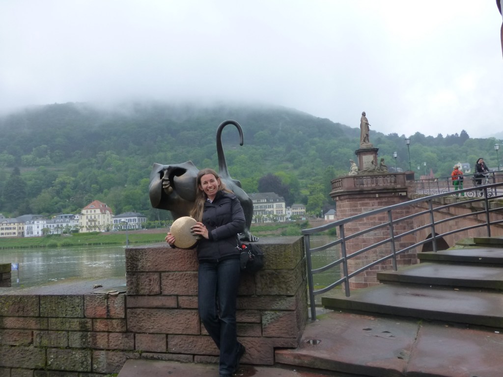 Върнах се обратно към Стария мост, на който точно до красивите арки се намираше и една статуя на маймуна държаща огледало. Докато снимах статуята и всички образи около нея, покрай мен мина едно дете с училищна чанта. Малко смутено мина покрай мен и потърка пръстите си в огледалото и пръстите на маймуната, след което се затича, вероятно за училище. Приех това като положителен знак, носещ късмет. Надявах се днес да не изпитват този ученик или поне да му напишат висока оценка. Аз също потрих пръстите си в тези на маймуната, както и изтърканото й и отразяващо се огледало. Погалих за късмет и каменни свитък хартия положен до маймуната, както и двете малки мишлета в близост. В последствие научих, че галенето на огледалото носело богатство, галенето на мишлетата вещаело много деца, а докосването на пръстите на маймуната – повторно завръщане в Хайделберг. Благослових наум отново това дете, което ми показа, че този паметник не беше сложен там само за снимки.