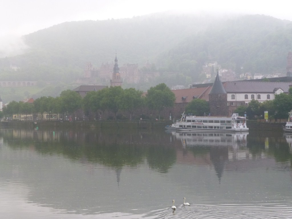 Снимките от панорамната алея се изсипваха като дъжда преди това. Облаците продължаваха да придават приказна мистичност на града, а светлината в утрешните часове караше всички сгради да се отразяват в реката Некар и се получаваха чудесни снимки. Продължих разходката си по алеята, снимайки също обособените китни панорамни тераси, някои от тях обкичени с много цветя и дори с палми. Имаше красиви беседки и пейки. Дъждът ги бе намокрил сутринта, но облаците не бяха скрили красивата гледка, която се разкриваше от тях. На места бяха обособени и информационни табла със снимки и карти на Хайделберг през годините. Птиците продължаваха да пеят. Въздухът беше чист и свеж, и на мен ми беше много приятно. Спуснах се по едни други стълби, минавайки покрай красиви жилищни постройки и скъпи къщи. Озовах се на крайбрежната алея, където разходката и снимките ми продължиха. Красивите къщи се оглеждаха в реката, в която плуваха лебеди и чапли.