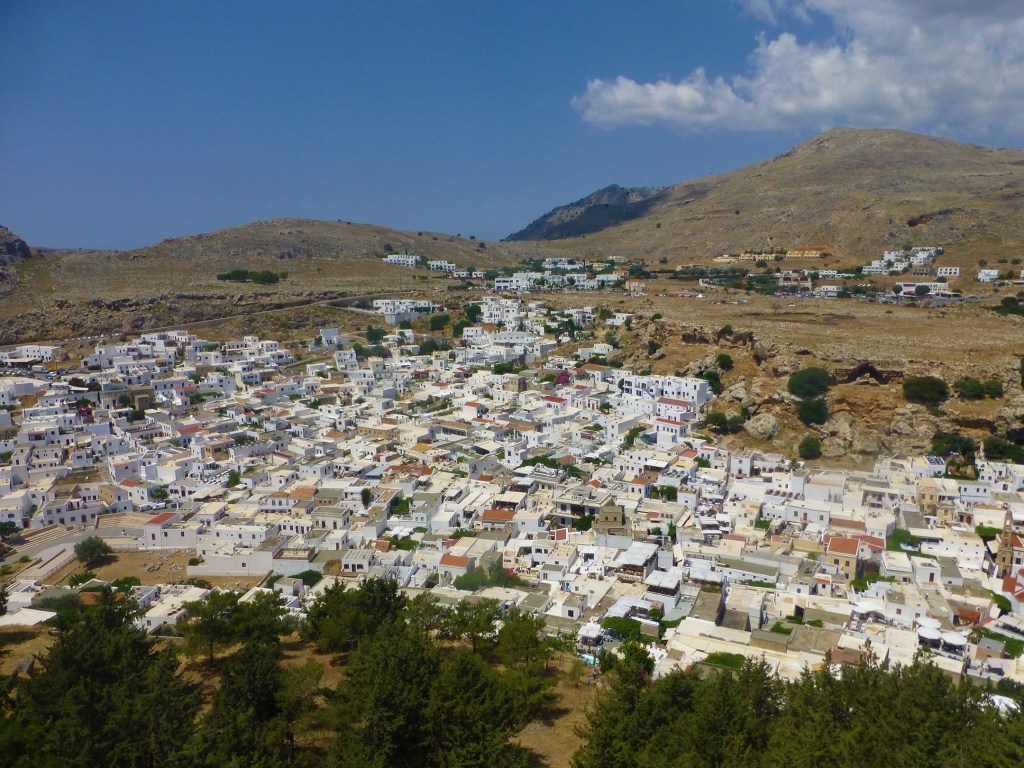 Първото нещо, което видяхме от Линдос бе красивият замък издигнат гордо на един хълм, оглеждащ се от три страни в морето. В подножието му имаше множество традиционни бели къщи с кафяви покриви, които наподобяваха белите къщи в Санторини и Миконос, които обаче бяха със сини покриви.