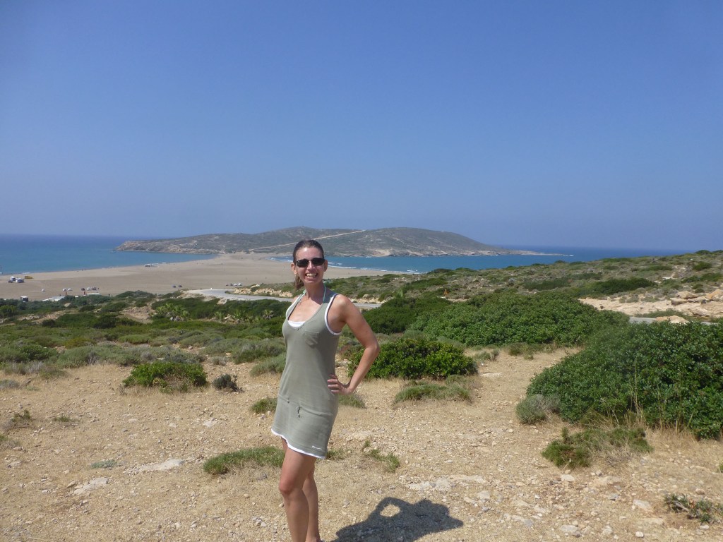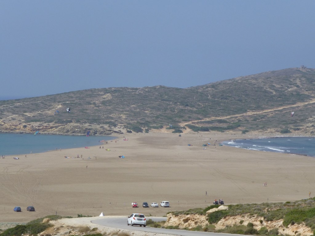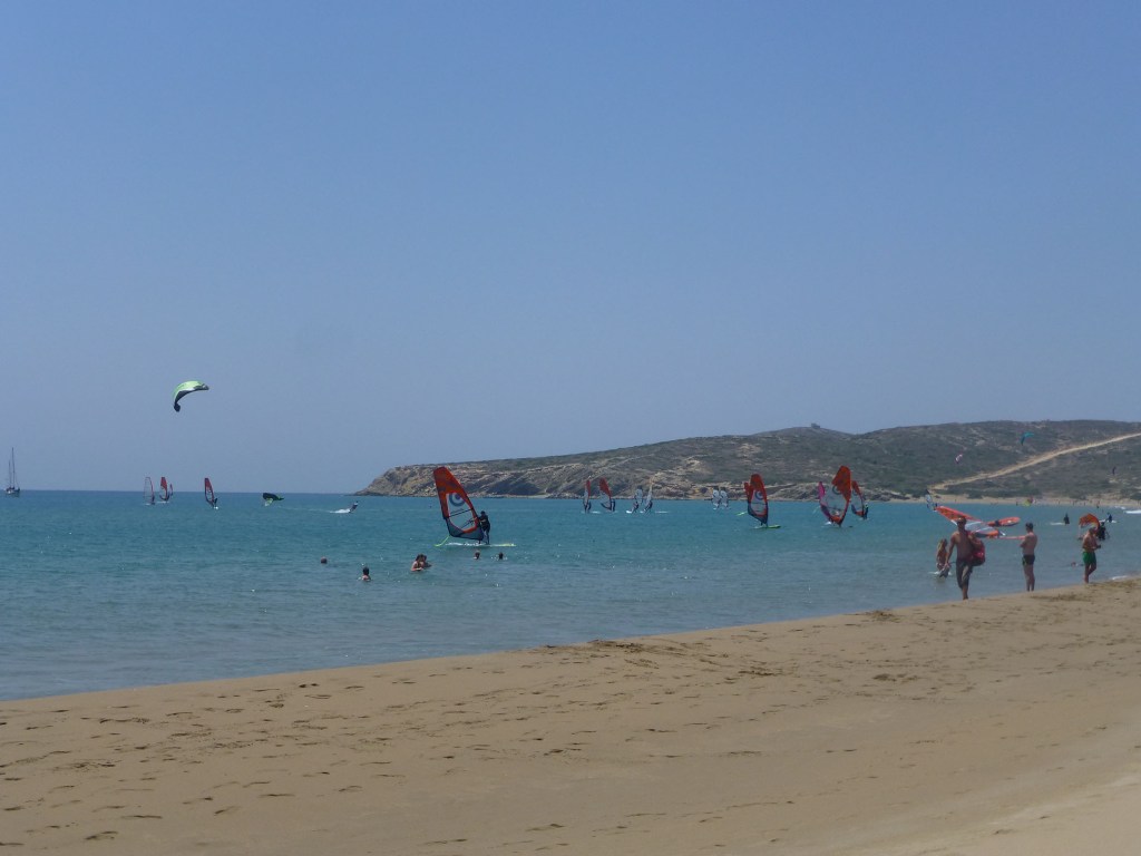 Трябваше ни цял друг ден да обиколим и красивите плажове на острова. Отправяйки се към най-южната точка на острова – Прасониси. Името означаваше „зелен остров“ и представляваше остров, свързан със сушата посредством пясъчна ивица. Интересното на този плаж бе, че от лявата страна хората се къпеха в Средиземно море, а от дясната страна – в Егейско. Ние се избрахме място за плажуване от страната на по-спокойното и топло Средиземно море и само след минута препичане вече бяхме в кристално чистите морски води. Плажът беше пясъчен, така че нямахме нужда от водните обувки, които носехме за каменистия западен бряг. Освен за плуване, водата ставаше и за сърф, като нямаше толкова вълни, колкото вятър.