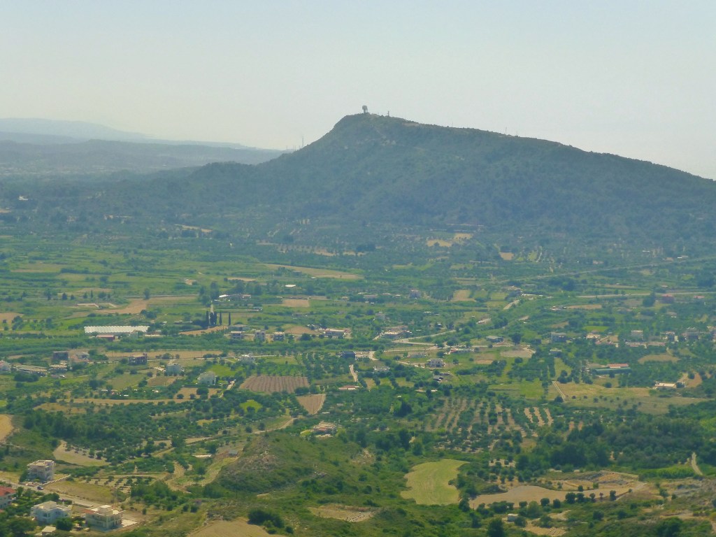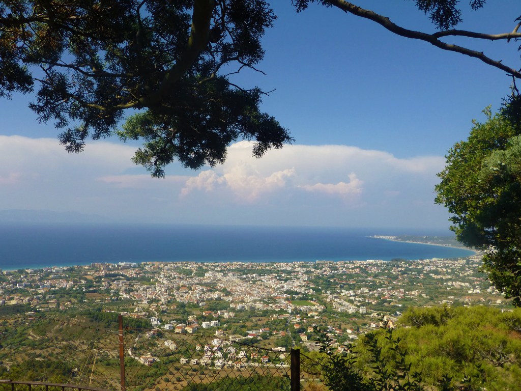 Колкото и да бе впечатляващ кръста, пейзажът, който се разкриваше от неговата панорамна площадка, го надминаваше. Съвсем ясно се виждаше зеленият хълм с борови насаждения, по който се бяхме изкачили, в низината му небрежно излегнал се на морския бряг стоеше гр. Ялос, а синьото море се преливаше по цвят със сините планини (вероятно остров Сими и Турция), над които синееше в още по-блед нюанс небето.