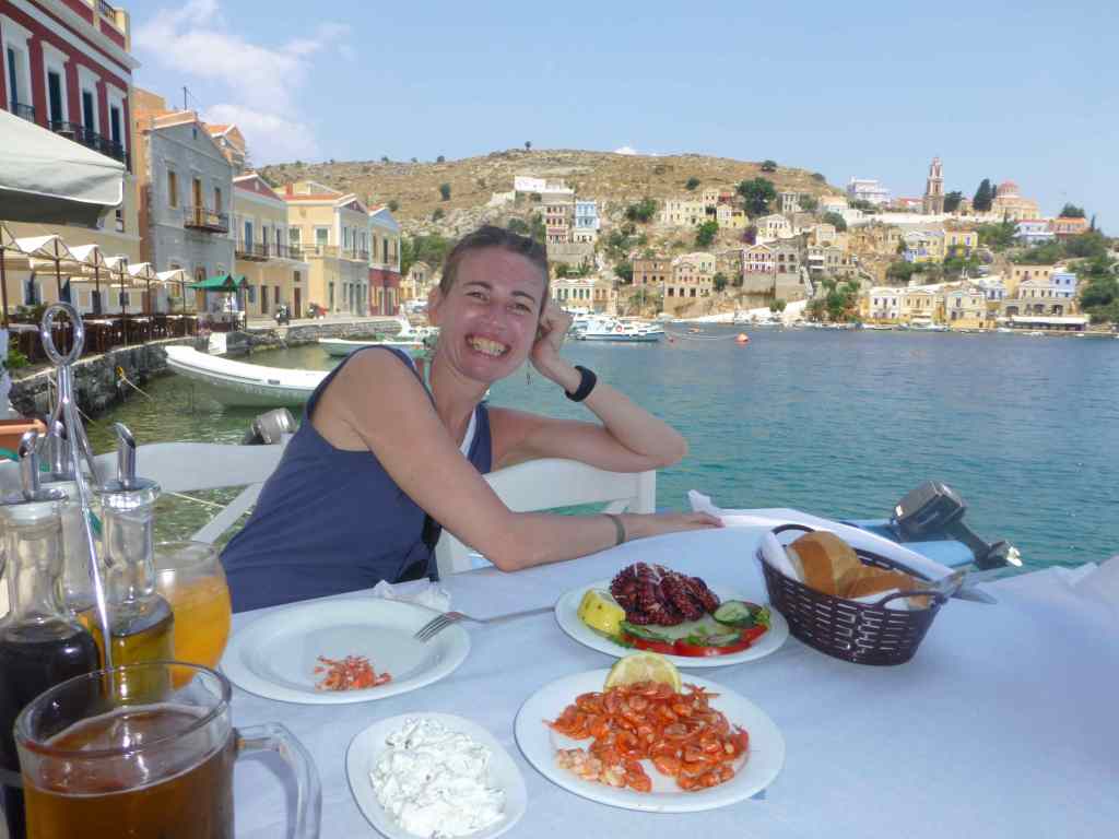 В непосредствена близост си харесахме едно ресторантче „Кабос“, в което си поръчахме печен октопод, пикантни скариди и салата тци-тцики. Беше уникално вкусно. Масата ни бе разположена на самия ръб на брега, от където можехме да се насладим не само на красивата панорама на Сими, но и на безбройните рибки, които идваха и се биеха във водата за късче подхвърлен хляб. Управителят на ресторанта на няколко пъти дойде да нахрани рибите, а те наистина бяха атракция и радваха не само нас, но и останалите посетители. Събираха се по толкова много риби, че ми се струваше, че трябваше само да протегна ръка и щях да ги уловя. Обядът ни обаче вече беше хванат, приготвен вкусно и ние му отдадохме цялото си внимание, обирайки до край чиниите, както рибите обираха и последните трохи.