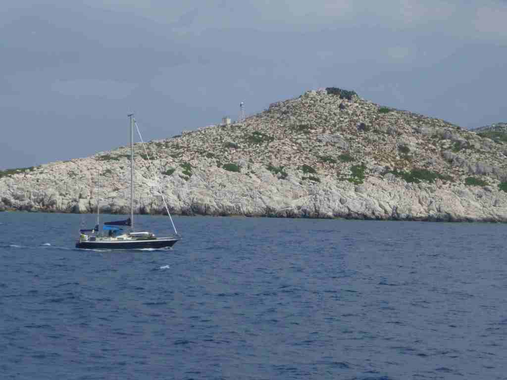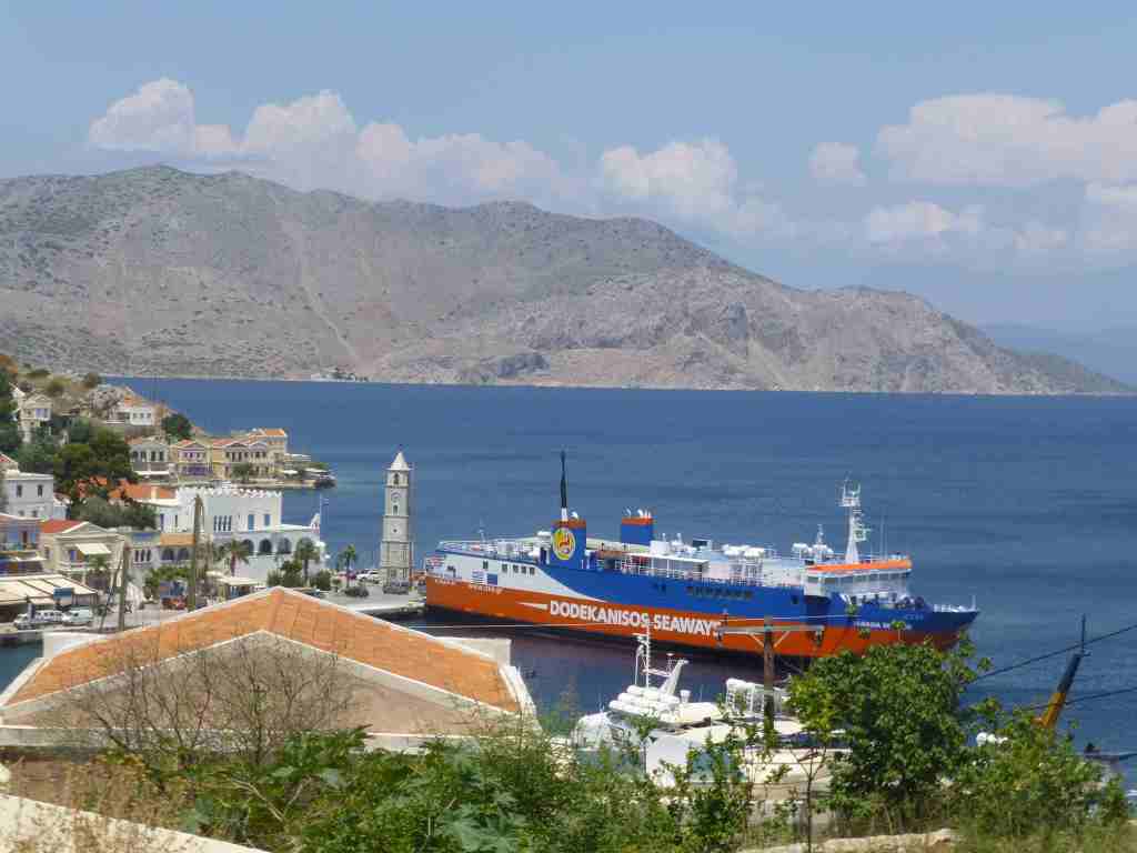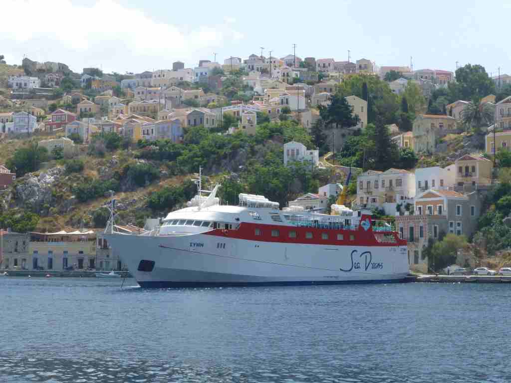 Пътуването с огромния кораб SYMI-Sea Dreams продължи около два часа. Първоначално си бяхме харесали места на най-горната палуба, но вятърът отвя желанието ни за това, и намерихме далеч по-слънчеви и на завет места на долната палуба. Там можех спокойно да снимам и от двете страни на кораба, а имаше какво да се фотографира. Опитвах се да запечатам всеки остров и скала, сякаш щях да използвам снимките след това да открия обратния път към дома. По пътя имаше и делфини, но бяха твърде бързи за снимки.
