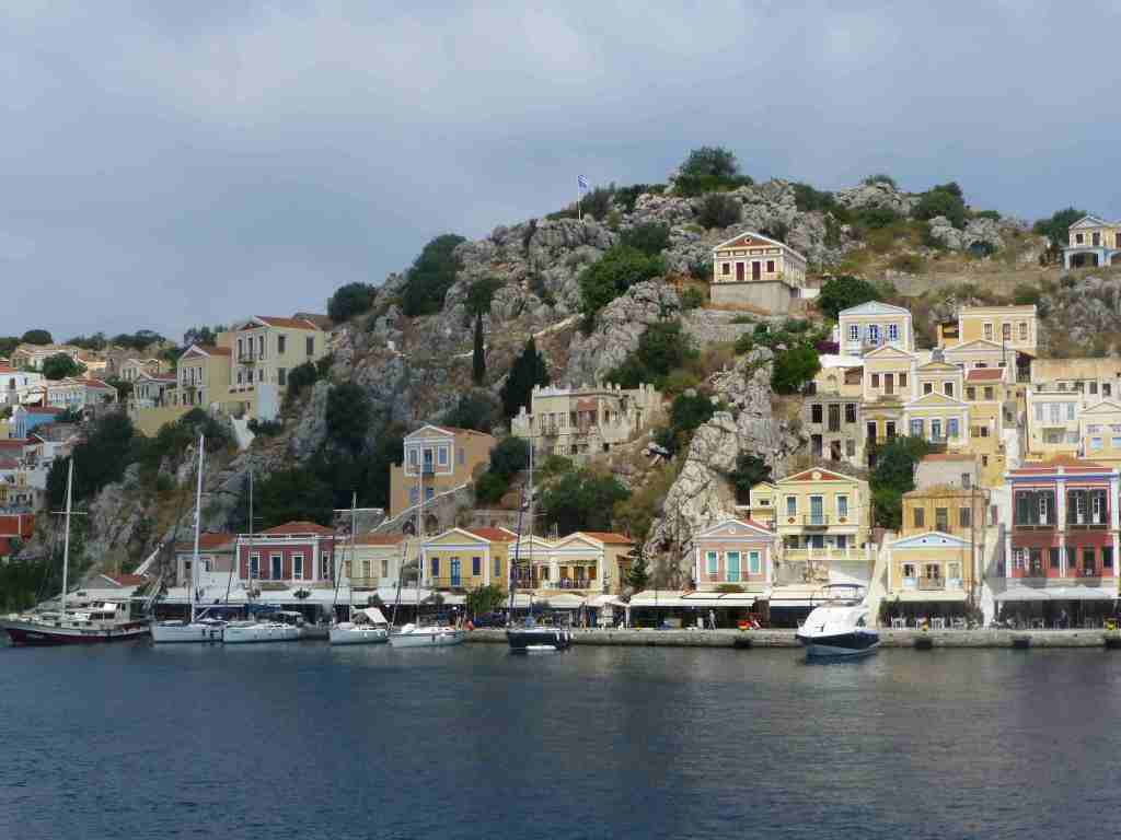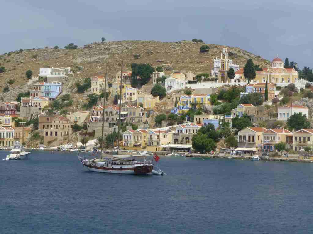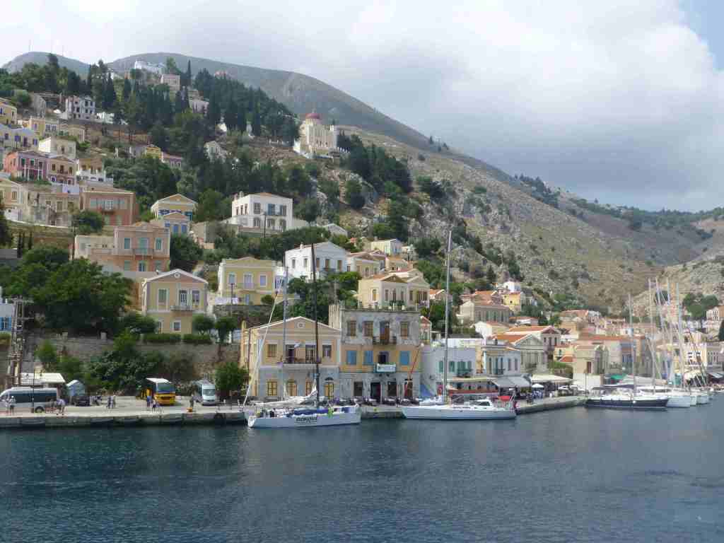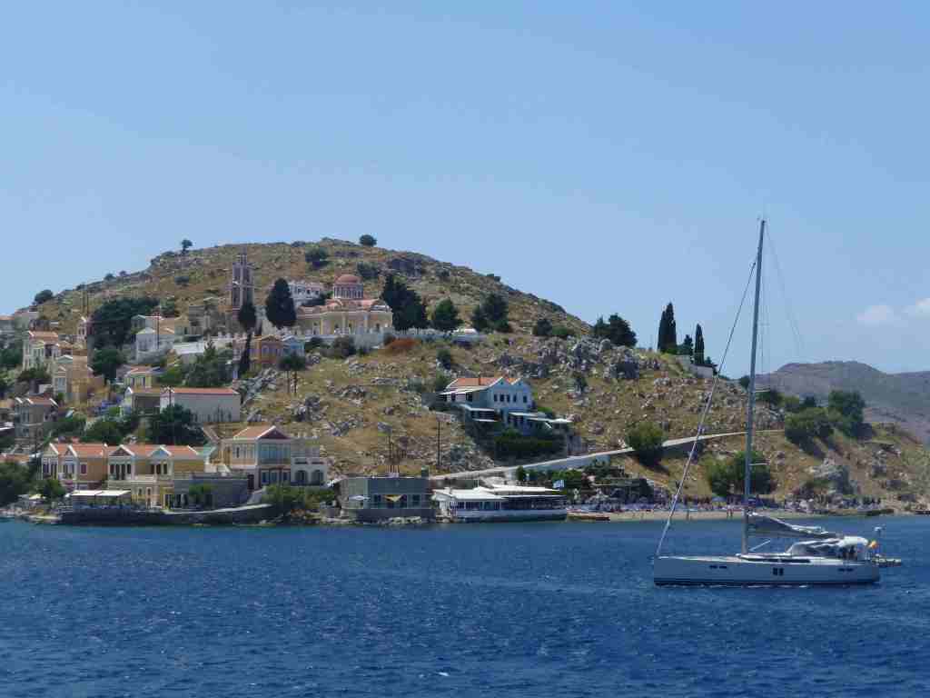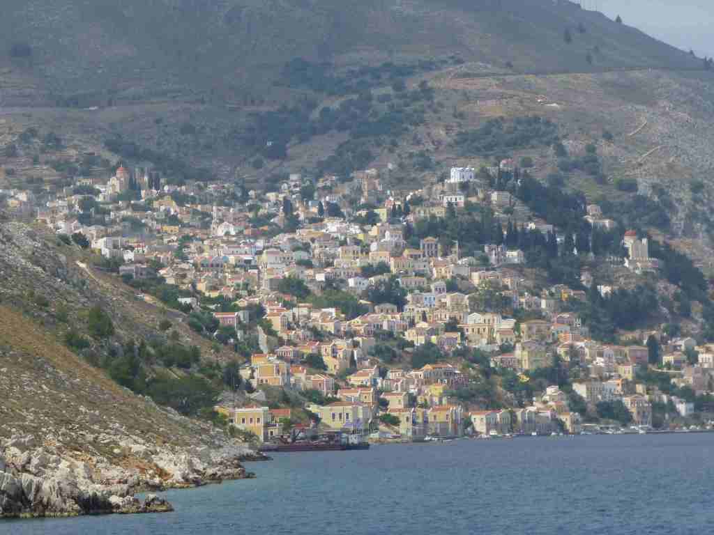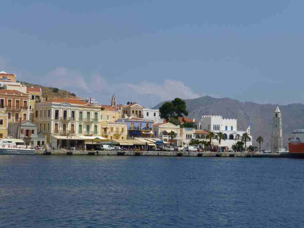 Два часа след като тръгнахме, към 11:00 часа, бяхме на пристанището на остров Сими и аз като дете тичах от палуба на палуба да го снимам от всички страни. Пъстри китни къщи бяха накацали по хълмистия бряг, придавайки на град Сими истинско очарование. Бях възхитена и доволна, че вятърът ни довя до това красиво място.