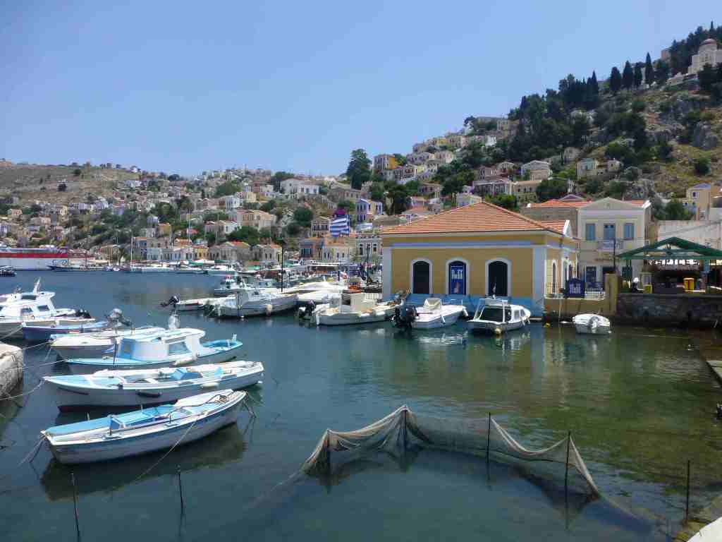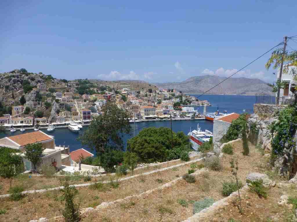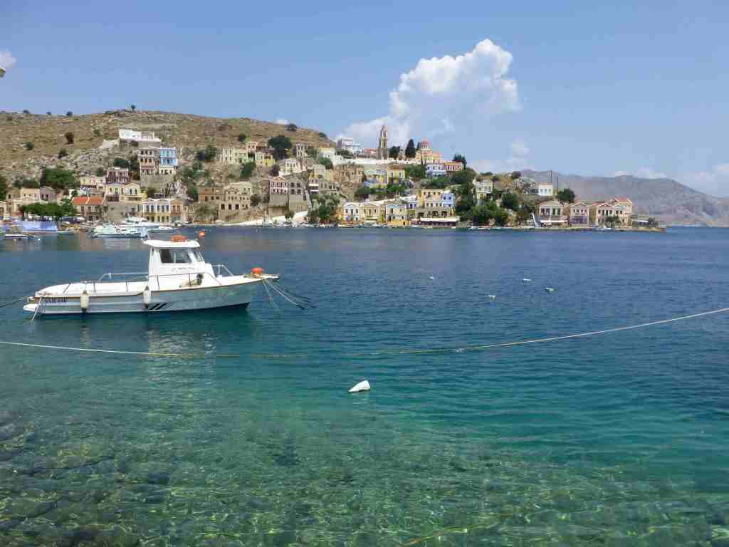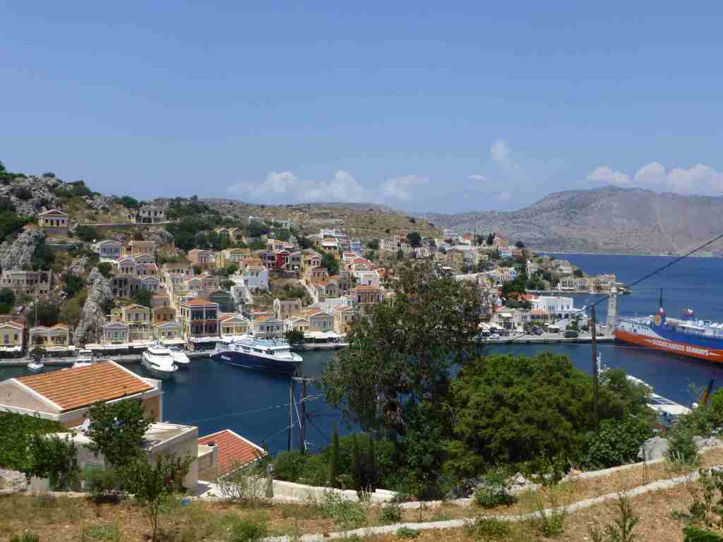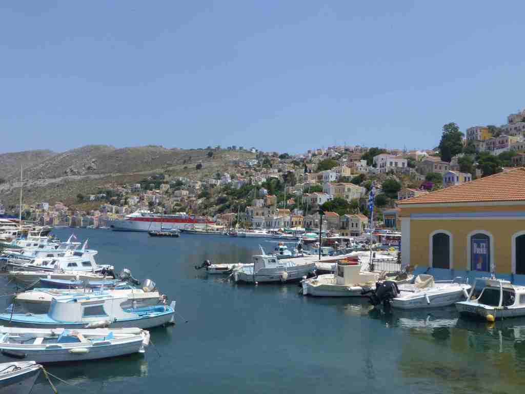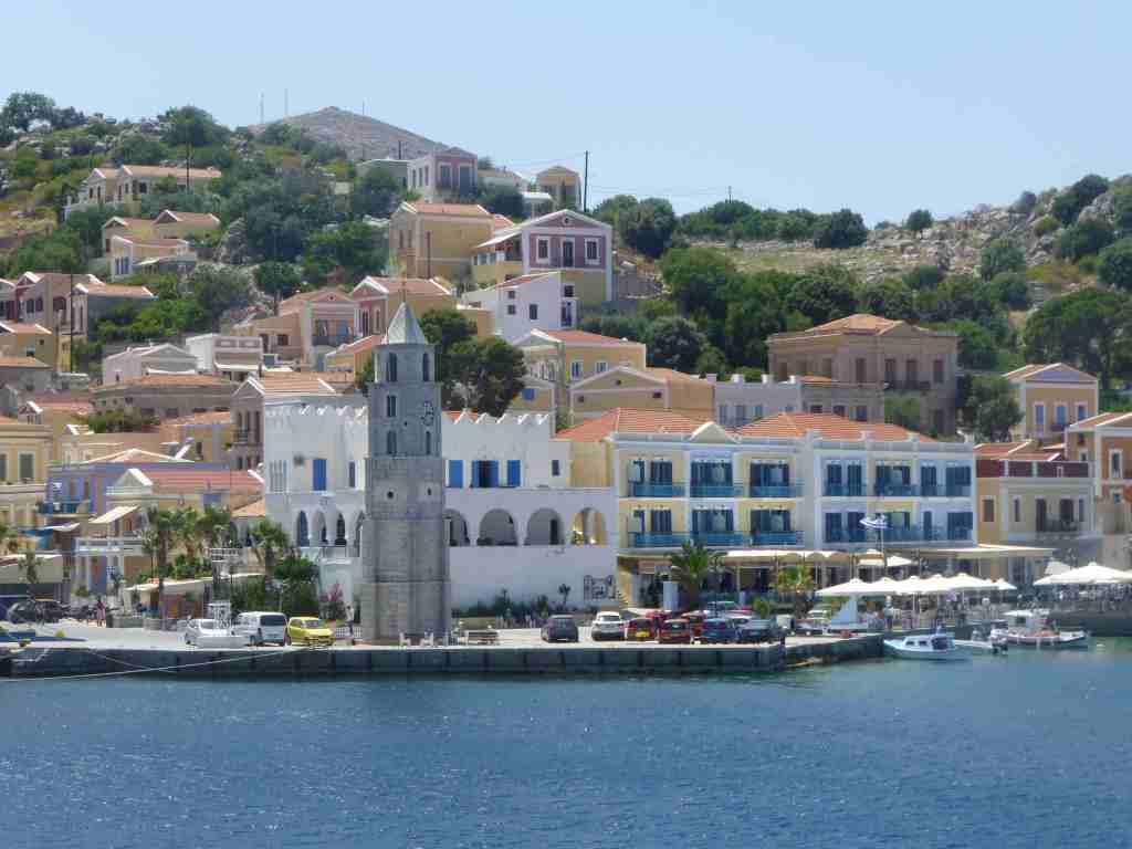 Два часа след като тръгнахме, към 11:00 часа, бяхме на пристанището на остров Сими и аз като дете тичах от палуба на палуба да го снимам от всички страни. Пъстри китни къщи бяха накацали по хълмистия бряг, придавайки на град Сими истинско очарование. Бях възхитена и доволна, че вятърът ни довя до това красиво място.
