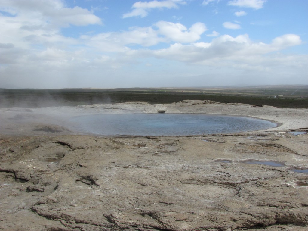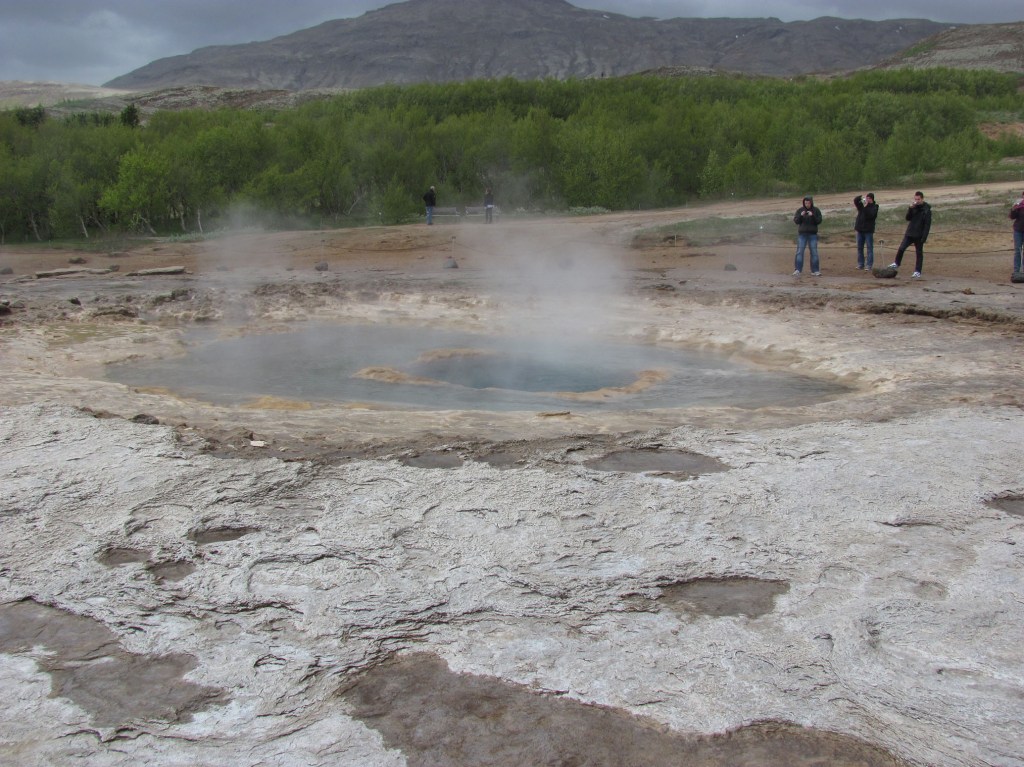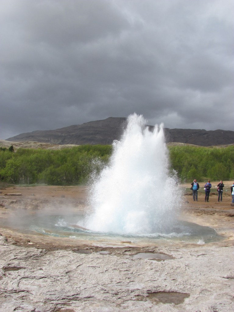 Само на 15 минутно разстояние с автобуса стигнахме и до прочутия гейзер в Исландия. Самото име „гейзер“ на исландски означава изригвам, и така местните наричат тази изригваща вряла вода на 20 метра височина, разположена на 80 км от столицата. В цялата страна има още много други гейзери, но този бил най-известния. При последното земетресение, пластовете на земята се разместили така, че от Големият Гейзер вече не изригва вода, но точно срещу него се намира гейзера Strokkur, от който на всеки 3-4 минути изригва вода на 7 метра височина, при това с температура между 80 и 100 градуса!
