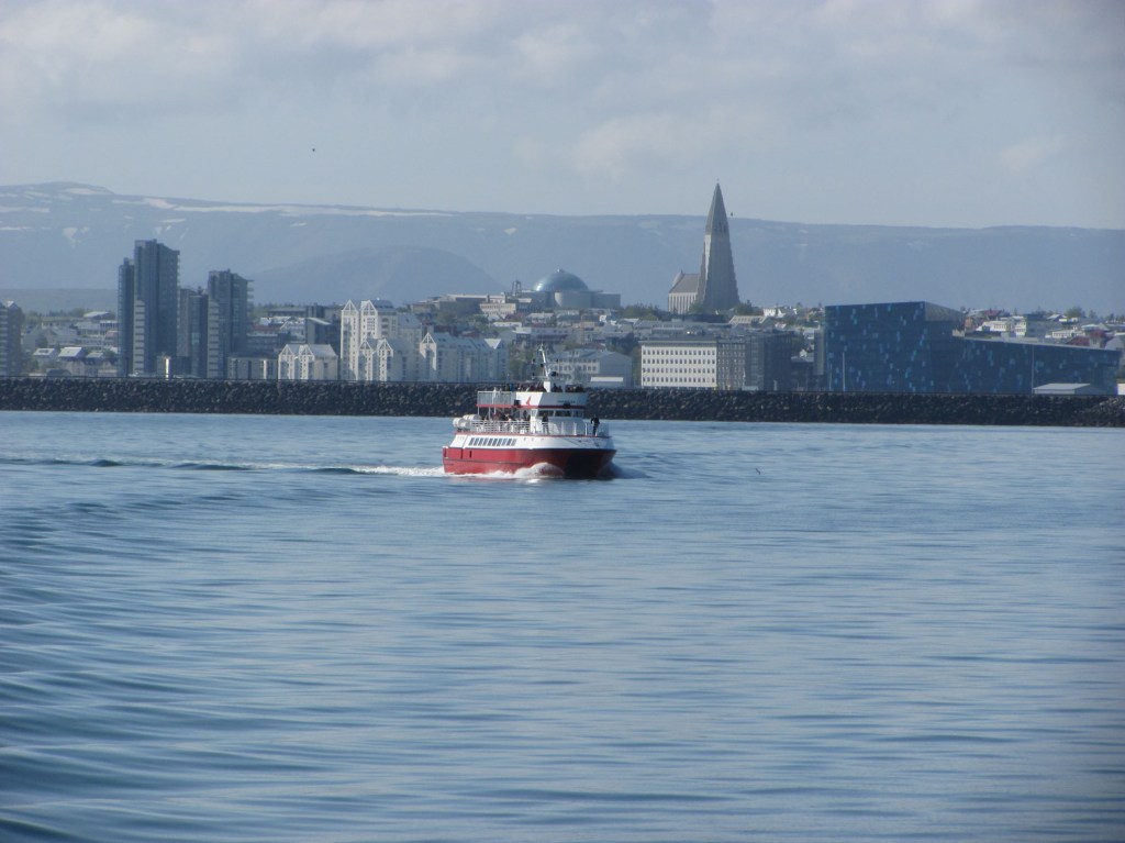 На следващия ден се събудихме огрени от ярки слънчеви лъчи още от ранни зори. През целия ден слънцето бе щедро към нас и ние се насладихме на поредното топло-ледено пътешествие. След засищащата закуска едно рейсче ни откара до старото пристанище, където се качихме на корабчето Elding. Предстоеше ни плаване в Северноатлантическия океан, с наблюдение на китове и екзотичните птици кайри. На английски птиците носят пухкавото име Puffin, на руски са познати като тупики, което също им подхожда имайки предвид комичната им походка, на български обаче носеха скучното име тъпоклюна кайра. Независимо от името, тези сравнително малки пилета много ми допаднаха, и ги обсипах със снимки, за разлика от китовете, които бяха много срамежливи и се наложи да се задоволя само със снимането на някой гръб. Китовете са бозайници и за това, се очакваше на всеки 5 минути да се издигат на повърхността и ние съответно да ги снимаме, но океана бе твърде голям дори за тях и не беше никак лесно да се проследят. Стояхме в океана с часове, а всичко, което успях да снимам е едно гръбче. Затова пък със собствени очи видях тези огромни и прекрасни водни обитатели.