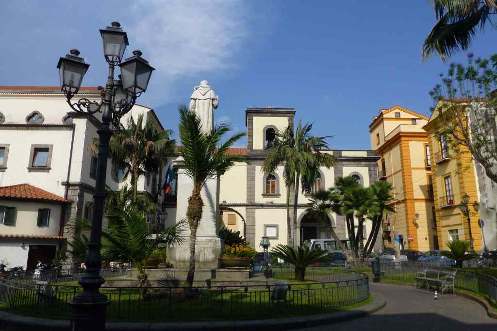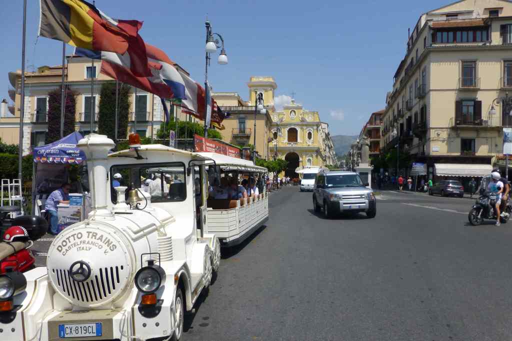 В 13:45 часа от площад Тасо се качихме на туристическото влакче, с което решихме да обиколим Соренто и добием обща представа за града, набелязвайки си местата за разходка. Във влакчето имахме слушалки, по които на различни езици ни разказваха за забележителностите в Соренто. Първата такава остана от дясната ни страна – църквата Сант Антонио, кръстена на един монах. Базиликата се намираше на площад, който носеше същото име. Била издигната през 11-ти век на мястото на античен параклис, като днес вътре се съхраняваха ценни картини от Giovanni Bernardo Lama и Giacomo Del Po.