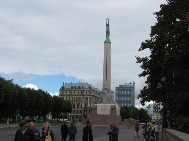 В края на красивите сгради се намира още по-красив фонтан на жена поливащи малки ангелчета под нея. От дясната страна минах през голям мост над канал, по който минаваха малки лодки и се озовах пред високия паметник на свободата. Същият е издигнат през 1935 г. и представлява 42 метрова колона, на чийто връх има 9 метрова статуя на жена с вдигнати ръце държаща 3 звезди, символизиращи трите исторически региона на Латвия – Latgale, Vidzeme и Curonia със Zemgale, и тяхното единство.