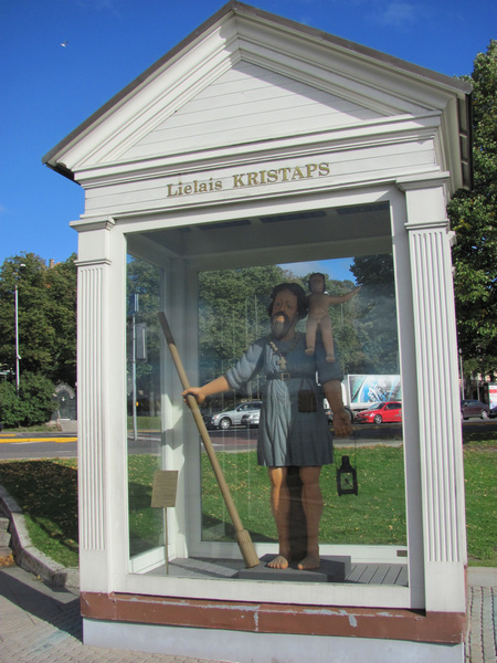 Тук видях и снимах известната статуя на Големия Христофор или както го наричат тук Lielais Kristaps. Представлява малка стъклена къщичка в гръцки стил, в която стои статуя на мъж с малко момче на раменете и с тояга в дясната ръка. Според легендата Големият Христофор е основал град Рига. Той помогнал на Исус да прекоси реката Даугава, след което намерил купчина със златни монети и ги използвал, за да издигне града. Оригиналната статуя се пази в музей, но и копието бе много сполучливо и се получиха хубави снимки.