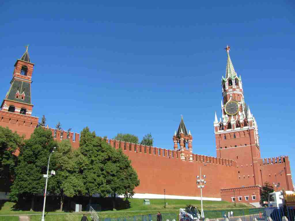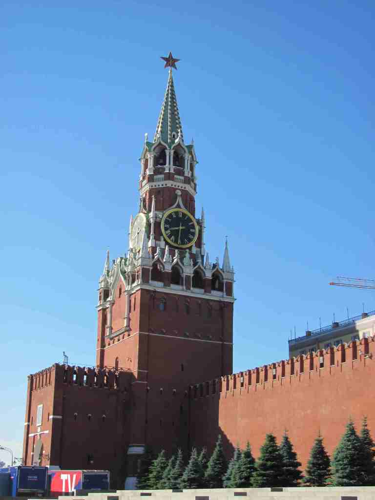 Часовниковата кула или т.нар. Спаската кула е вероятно най-сниманата от всичките 20 кули тук и често същата е използвана за символ на Московския кремъл. Всъщност кремъл означава вид руски градски укрепен район със замък на владетел. Московския кремъл представлява крепост с формата на неправилен триъгълник, построен заедно с кулите си през 1485-1495 г., като общата дължина на стените е 2235 м, височината им е от 5 до 19 метра, а дебелината от 3.5 до 6.5 м По стените са разположени 20 кули, от които 3 кули стоящи в ъглите на триъгълника са с кръгло сечение, а останалите с квадратно. Най-висока е Троицката кула с височина 80 м, а най-сниманата е Спаската, пред която стояхме сутринта и снимахме прочутия часовник, поставен още някъде между 1491-1585 г и показващ от тогава официалното московско време. Колкото до името Спаска, същото идва от поставената над входа икона на Св.Спас.