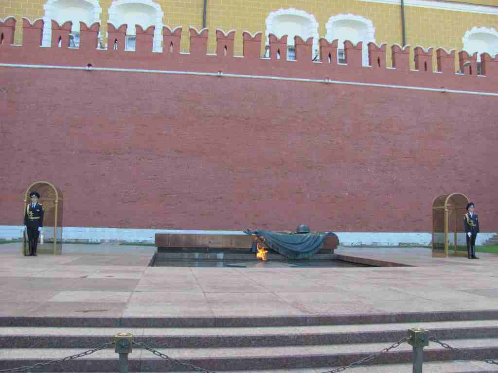 На Червения площад можехме да се разхождаме свободно нямаше входна такса, но за да минем от другата страна на крепостните стени ни трябваше билет и съобразяване с работното време, което започваше от 10:00 часа. Спуснахме се от Червения площад покрай крепостните стени и се озовахме пред запаления вечен огън, който се охраняваше от двама гвардейци. До огъня имаше големи плочи с имената десетки градове като Ленинград, Киев, Минск и др., наречени градове-герой след Втората световна война.