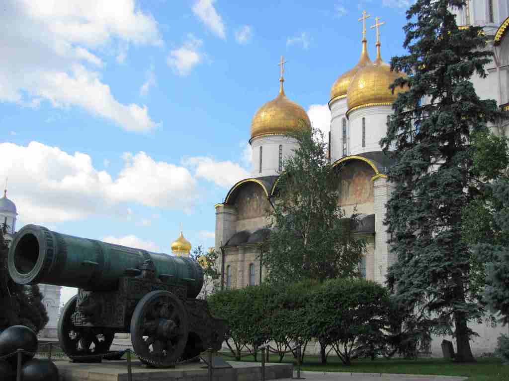 Освен с църквите не пропуснахме възможността да се снимаме и с цар топ, който е най-голямото оръдие, което обаче никога не е стреляло. Огромното и тежащо 40-тона оръдие с дължина 5.34 м и диаметър в долната част на цевта 1200 мм е издигнато през 16-ти век пред Спаските порти, като е трябвало да защитава Кремъл от посока Московска река. Днес същото е записано в Книгата на рекордите Гинес, като продължава да сочи в посока реката, която се вижда в низината на крепостта. Всъщност имено тази река дава името на града – Москва.