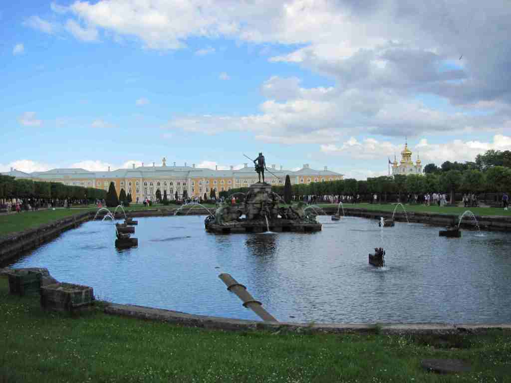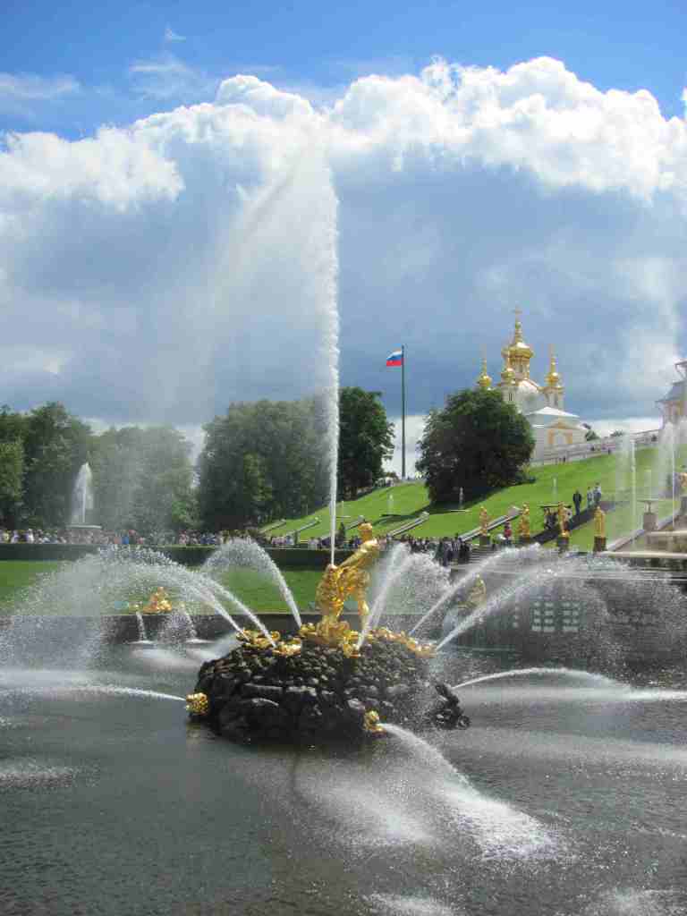 В слънчевия 14 юни, посетихме прекрасния дворец Петерхоф, разположен на 30 км южно от Санкт Петербург, на южния бряг на Финския залив. Дворецът бе уникално красив с огромни градини и фонтани. Не случайно го сравняват с Версай, макар руснаците с гордост да отбелязват, че дворецът им е много по-изящен и че има нещо, което Версай няма – излаз на море. Да си призная, въпреки че съм франкофонка по сърце, Петерхоф ми хареса повече от Версай и причина за това несъмнено са множеството фонтани с красиви позлатени статуи. Фасадите на всички сгради тук са пищни и богато украсени. Самият дворец е построен в стил барок между 1710 – 1755 г. по нареждане на Петър Велики и същият е служил като извънградска резиденция на царя. Съхранени са доста скици и документи, по които е видно, че общата концепция на дворцовия комплекс, както и голяма част от детайлните разработки в архитектурата и водоскочните съоръжения принадлежат на царя. Самото име на комплекса има нидерландски произход Peterhof, което в превод означава „дворът на Петър”.