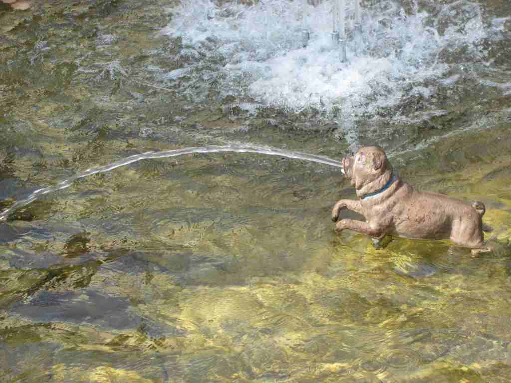 Възхитени от Голямата каскада се спуснахме към долния парк, като екскурзоводката ни показа малък фонтан с движещи се фигури на диви патици и ловджийско куче, всяко от което плюеше вода, докато се движи и леките шумове на крякане и лаяне всъщност се създават от тръбите и водата, а не от някаква допълнителна звукова система.