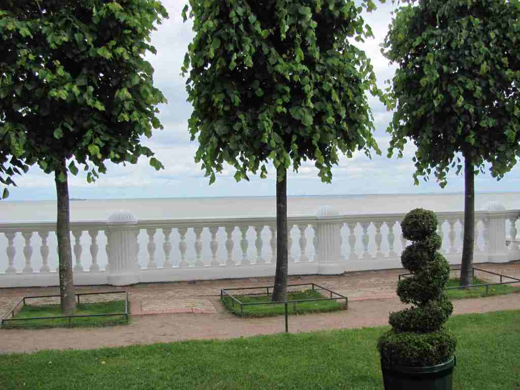 Отправихме се към красива дворцова сграда, която в момента помещаваше ресторант. В парка между другото имаше и други такива сгради, но тъй като вече се движихме без екскурзовод бе трудно да преценим коя коя е. На крайбрежната алея разпознахме двореца Мон Плезир, който с червената си фасада се вижда навътре в морето и целял да посреща гостите на замъка. Всъщност целият дворцов комплекс започнал с изграждането на Мон Плезир.