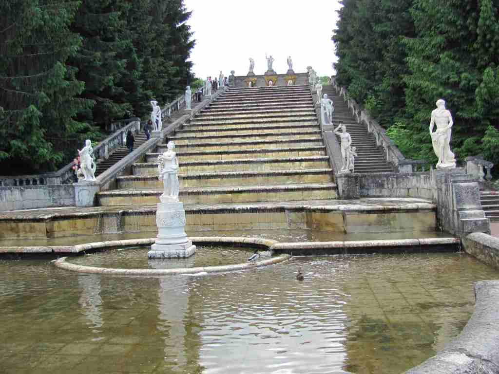 Минахме покрай различни беседки и фонтани докато стигнем до следващата впечатляваща каскада, този път т.нар. шахматен фонтан или драконовия фонтан, зад който също имаше пещера и ние с любопитство гледахме как водата се спуска пред входа й. Около фонтана са подредени различни мраморни фигури, а най-отгоре през 1739 г. са поставени три ярки драконови фигури.