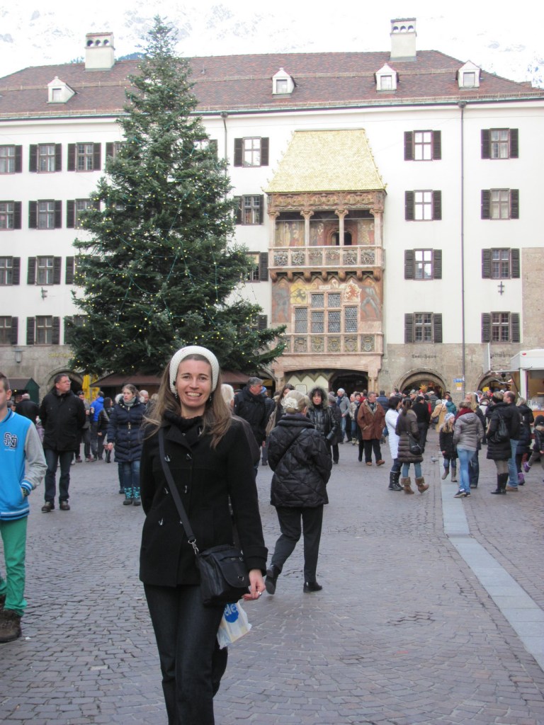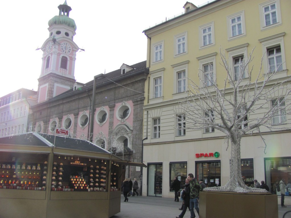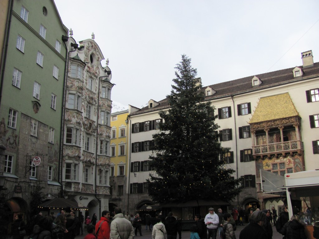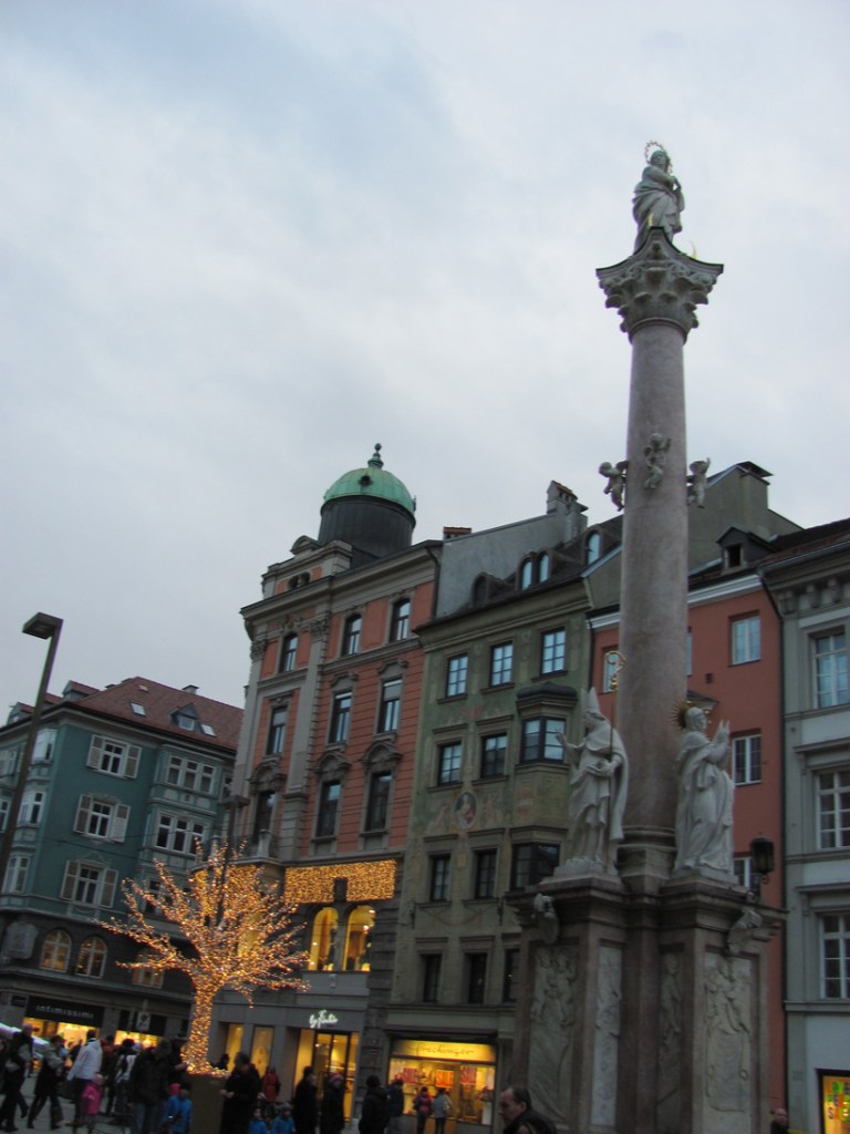 We continued along the wide boulevard Maria Theresa, on both sides of which there are beautifully painted buildings. We reached the column of Annasäule, which was erected as a thank you for the withdrawal of the Bavarian army, on July 26, 1703 (St. Anne’s Day). At the top of the column is a statue of the Virgin Mary, and below it the Baroque figures of St. Anne. St. Cassian, St. Vigilj and St. Georgi. During our visit to the square was formed a beautiful Christmas market with many wooden houses and stalls, giving an even more fabulous atmosphere.