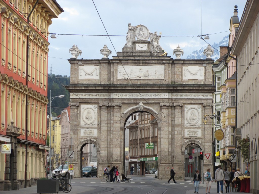Our walk in Innsbruck began from the Arc de Triomphe erected at the southern end of Maria Theresa Street. It was erected by order of Maria Theresa on the occasion of the wedding of her son Leopold to Maria Ludovica of Bourbon-Spain in 1765. At the same time, however, her husband Emperor Francis I died suddenly, so the southern ornaments of the arch symbolize joy and wedding. And the north side is the tragic death.