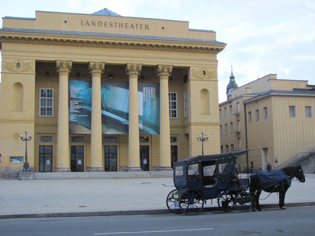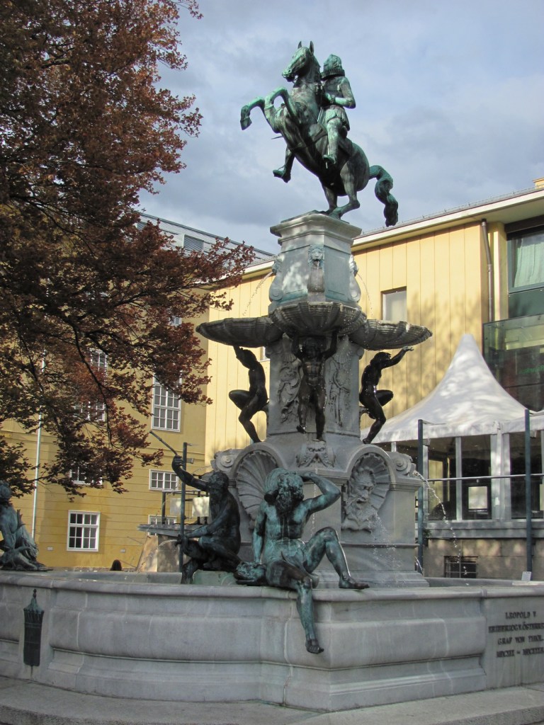 In front of the theater stands a beautiful fountain of Leopold. Leopold V ruled the city from 1618 to 1632. He commissioned the drawing up of the fountain in 1621, but it was not until 1893 that it was completed according to the original plans. The statue of Leopold V is unique as it stands on a horse, on which only the hind legs serve as a support, without the tail having to further hold the figure, as in many other places.