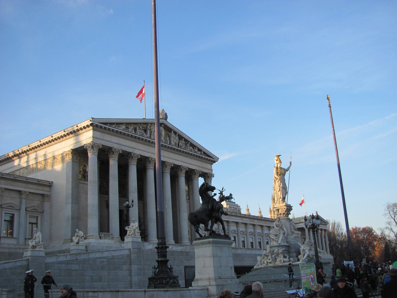 From here you can continue your walk to the parliament, which is less than 5 minutes away and in front of which is erected a magnificent fountain of Pallas Athena – the goddess of wisdom. Under Athens stand the figures of four deities, symbolizing the four main rivers – Danube, Inn, Elbe and Vltava.