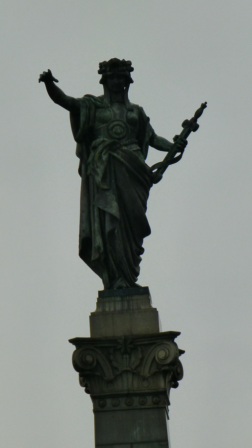 The statue itself is a column with a figure of a woman holding a sword in her left hand, pointing in the right direction from where the liberators came. Under the column, one bronze lion tears the slave chains with his mouth, and the other guards the Sword and the shield of Freedom.