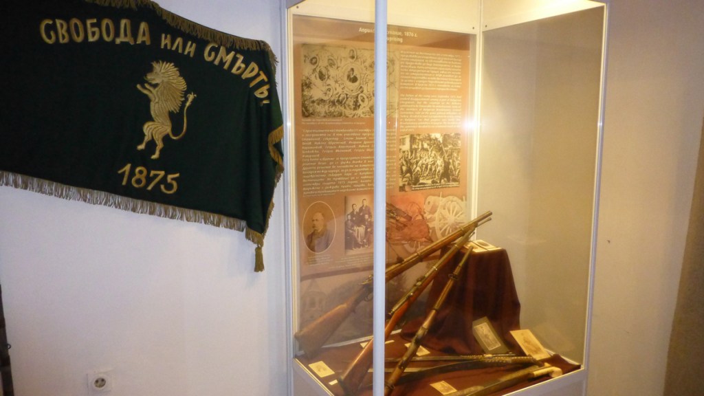 The museum was warm and cozy with 19th-century furniture. We looked at the beautifully arranged exhibits mainly weapons of the Bulgarian revolutionary and assistant apostle in the April Uprising, as well as his first historiographer with his book Notes on the Bulgarian Uprisings, then the main organizer of the Unification of the Principality of Bulgaria and Eastern Rumelia – Zahari Stoyanov. He was originally a shepherd boy and then apprentice as a tailor. His mother-in-law Grandma Tonka or more precisely Tonka Obretenova, who had 5 boys and 2 girls, was also highly involved in the organized national liberation struggle. Her daughter Anastasia Obretenova was married to Zahari Stoyanov, and her other daughter sewed the flag of the Chervenovoda rebel squad in 1875. The sons of grandmother Tonka Petar Obretenov and Angel Obretenov were rebels in the squad of Hadji Dimitar and Stefan Karadzha. The skull of Hadji Dimitar was exhibited in the museum. Her other son Nikola Obretenov was a part in the rebel squad of Hristo Botev, and in the museum there was a beautiful model of the ship Radetzky.