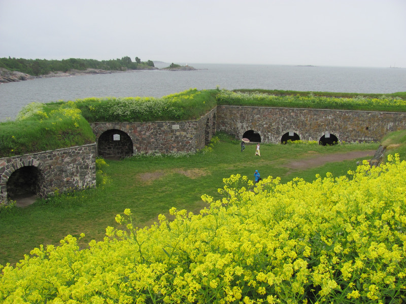 We found shelter in the information center, then continued along the beautiful alleys of the island laden with yellow flowers. We passed through the fortress walls and looked at the dark stone corridors. Then new alleys took us to the other side of the island, where there were many green hills with open hiding places representing military burials. Here the rain intensified and we hid in a tourist hut prepared for this purpose. It was a large one-storey wooden building, with numerous wooden tables and benches, as well as two toilets, nothing else. However, the roof above was enough, and we, like the other tourists, sat down at the tables and waited.